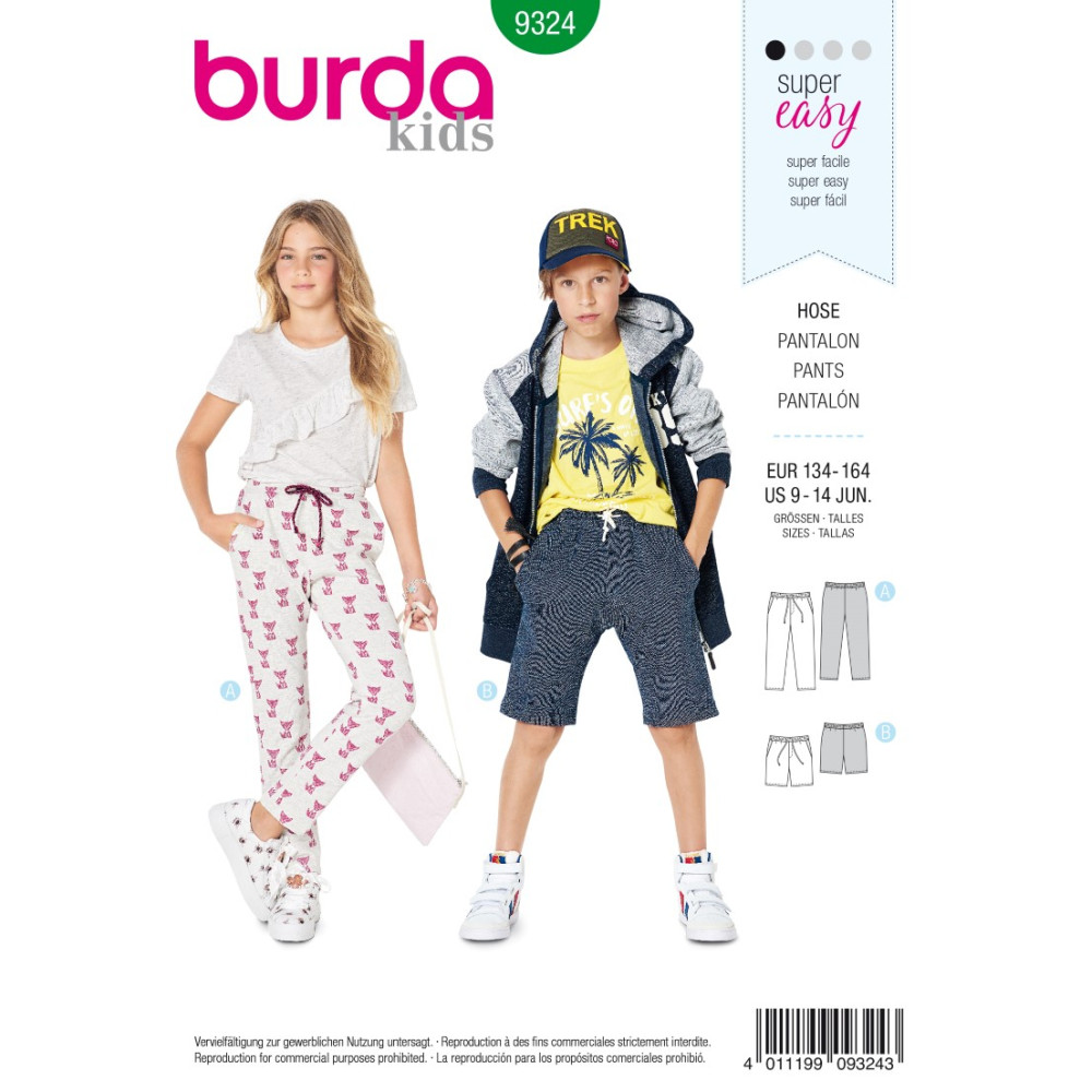 Střih Burda na jednoduché teplákové kalhoty a kraťasy s kapsami a pasem do gumy.