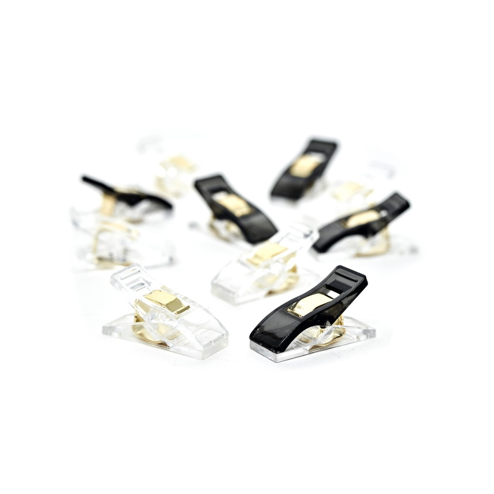 Velké balení 30 kolíčků na látky Premium v černé a transparentní barvě se zlatými prvky, snadno, bezpečně a šetrně beze stop udrží látky u sebe