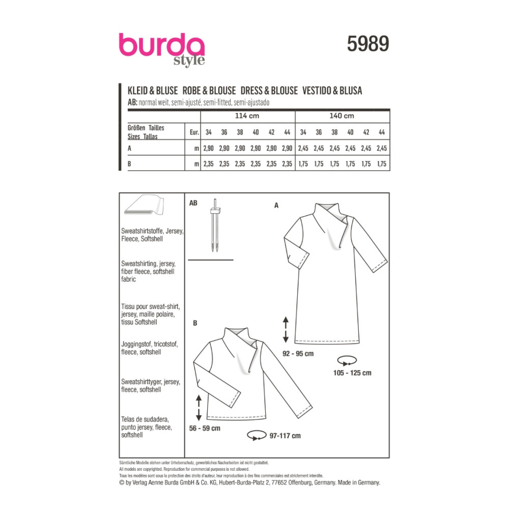 Střih ve velikostech EUR 34-44, úroveň obtížnosti šití: 2 lehká info, doporučené látky: teplákovina, žerzej, fleece, softshell