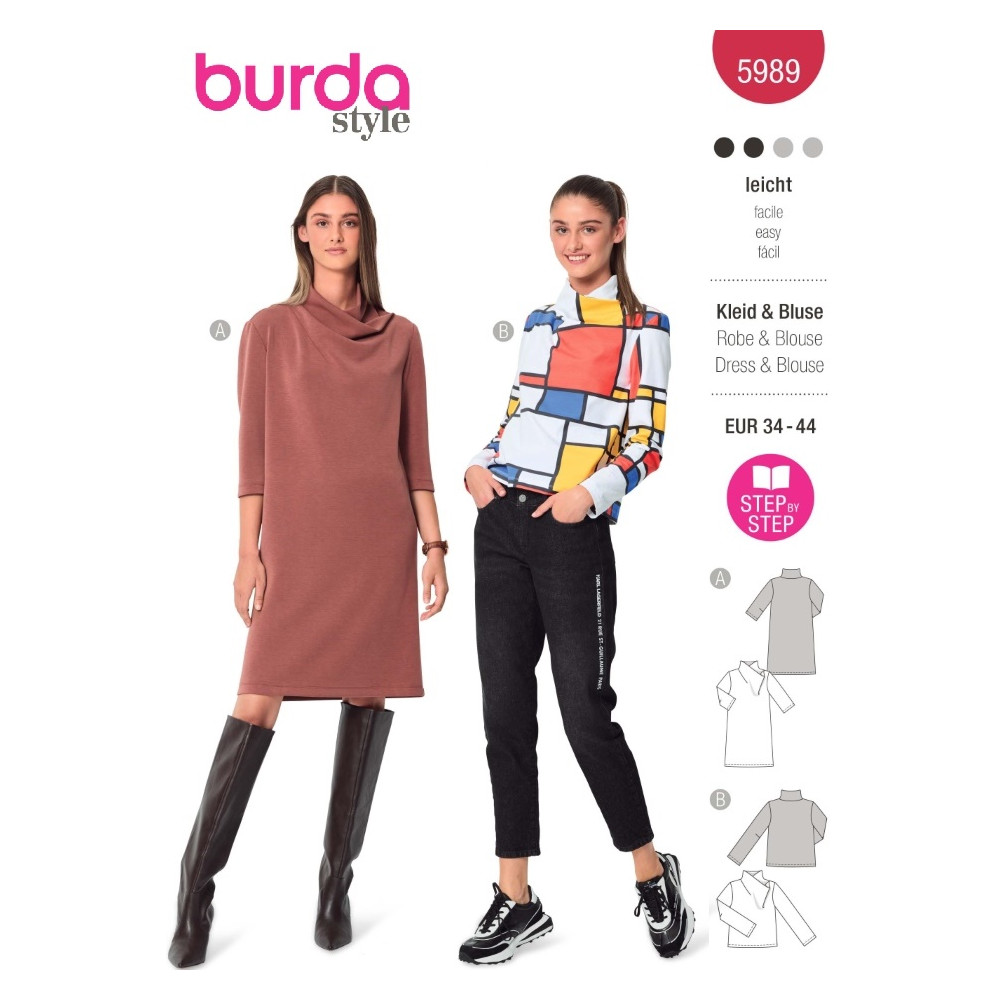 Střih Burda na jednoduché tričko a šaty s lodičkovým výstřihem a s řasením na bocích.