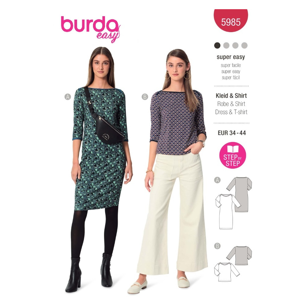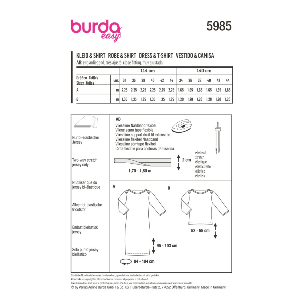 Střih ve velikostech EUR 34-44, úroveň obtížnosti šití: 1 velmi lehká info, doporučené látky: pouze bi-elastický žerzej