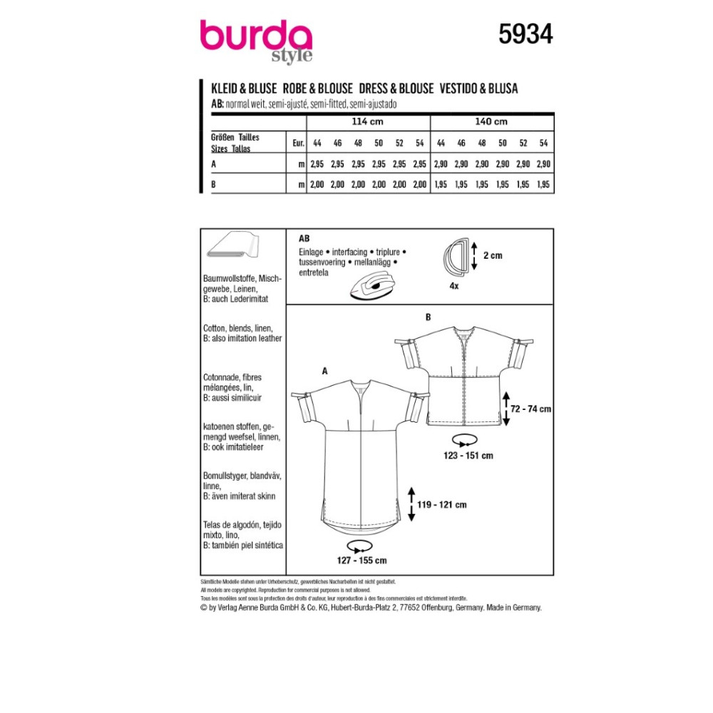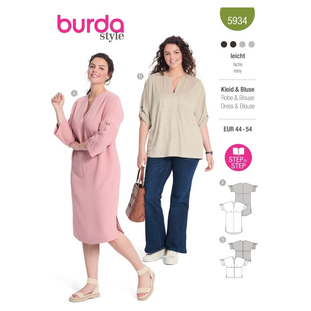Střih ve velikostech EUR 44-54, úroveň obtížnosti šití: 2 lehká info, doporučené látky: bavlna, směsové látky, len