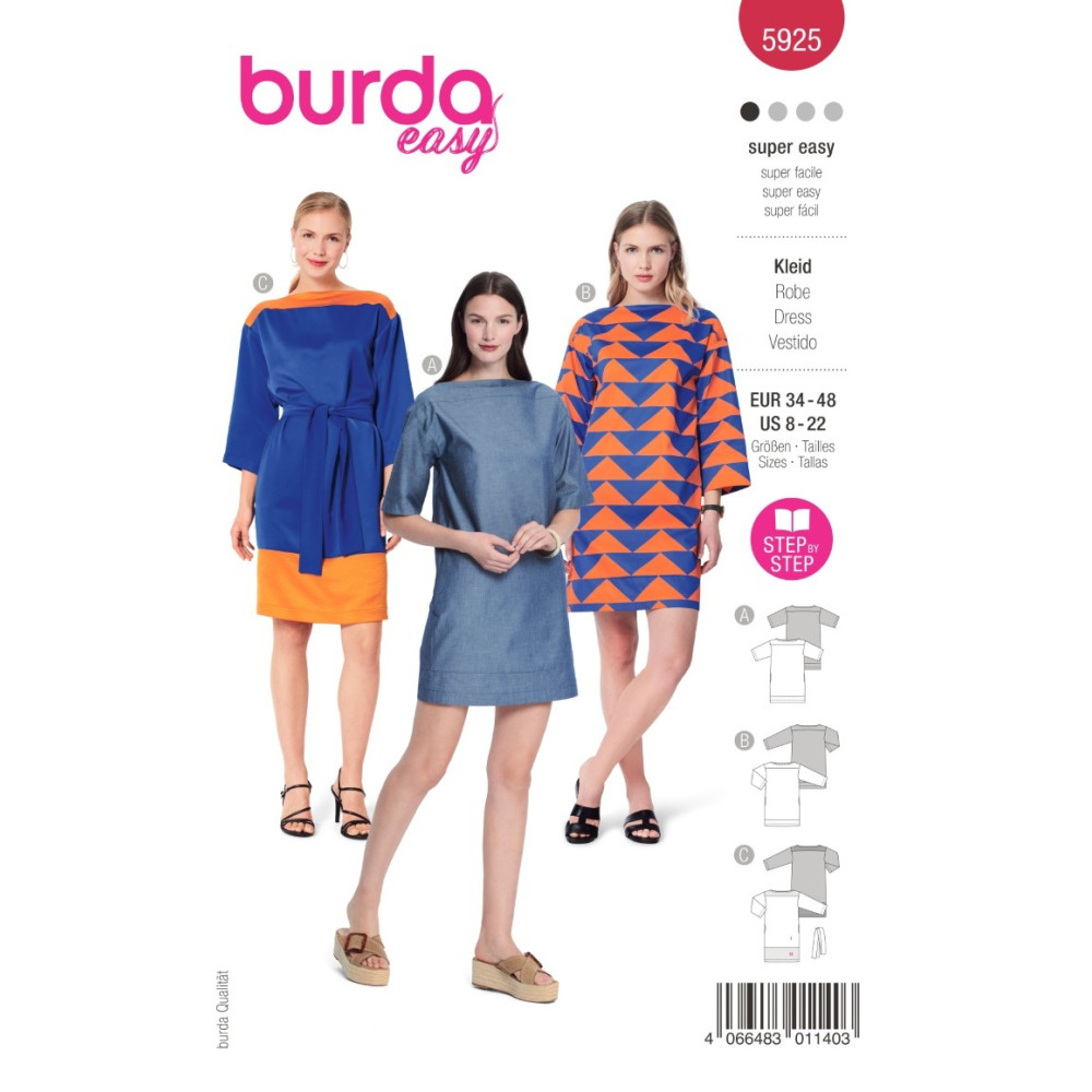 Střih Burda na pohodlné volnější šaty s delším rukávem nebo delším zvonovým rukávem.