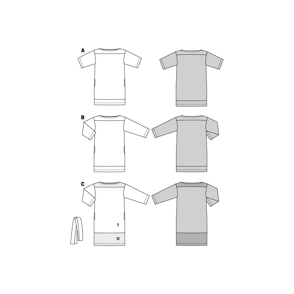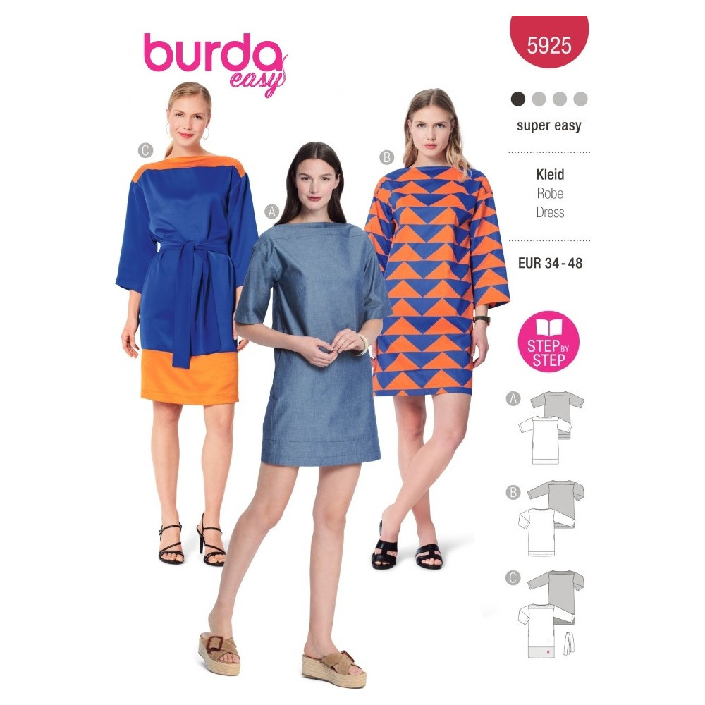 Střih ve velikostech EUR 34-48, úroveň obtížnosti šití: 1 velmi lehká info, doporučené látky: bavlna, viskóza, hedvábí, len