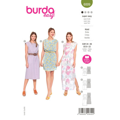 Jednoduchý střih Burda na tričkové šaty (3 délky) bez rukávů a s gumou v pase
