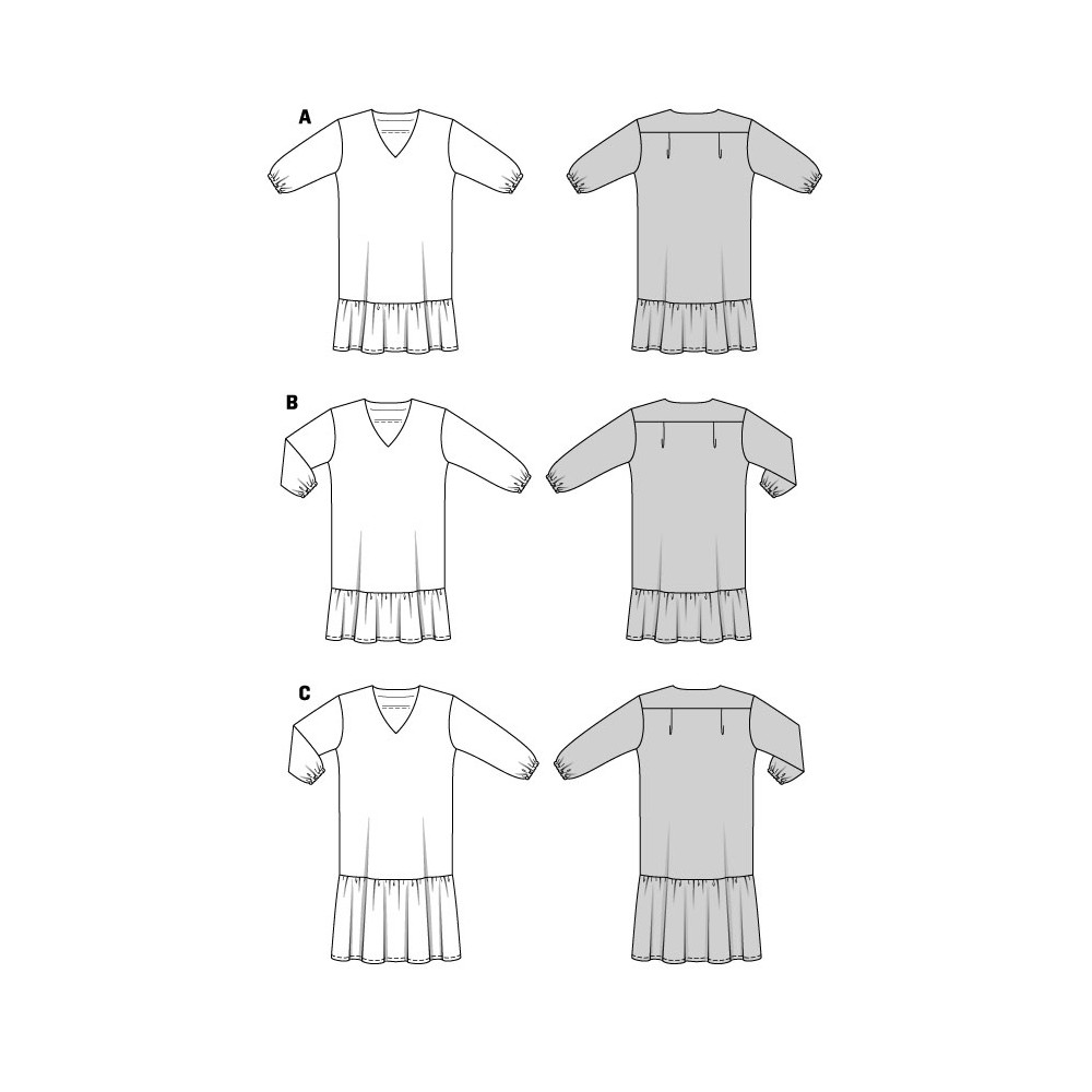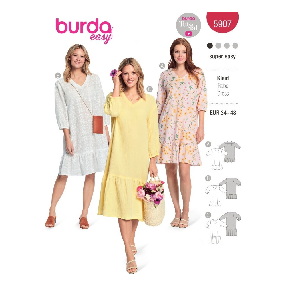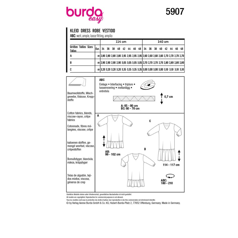 Střih ve velikostech EUR 34-48, úroveň obtížnosti šití: 1 velmi lehká info, doporučené látky: bavlna, viskóza, směsové látky, krepové látky