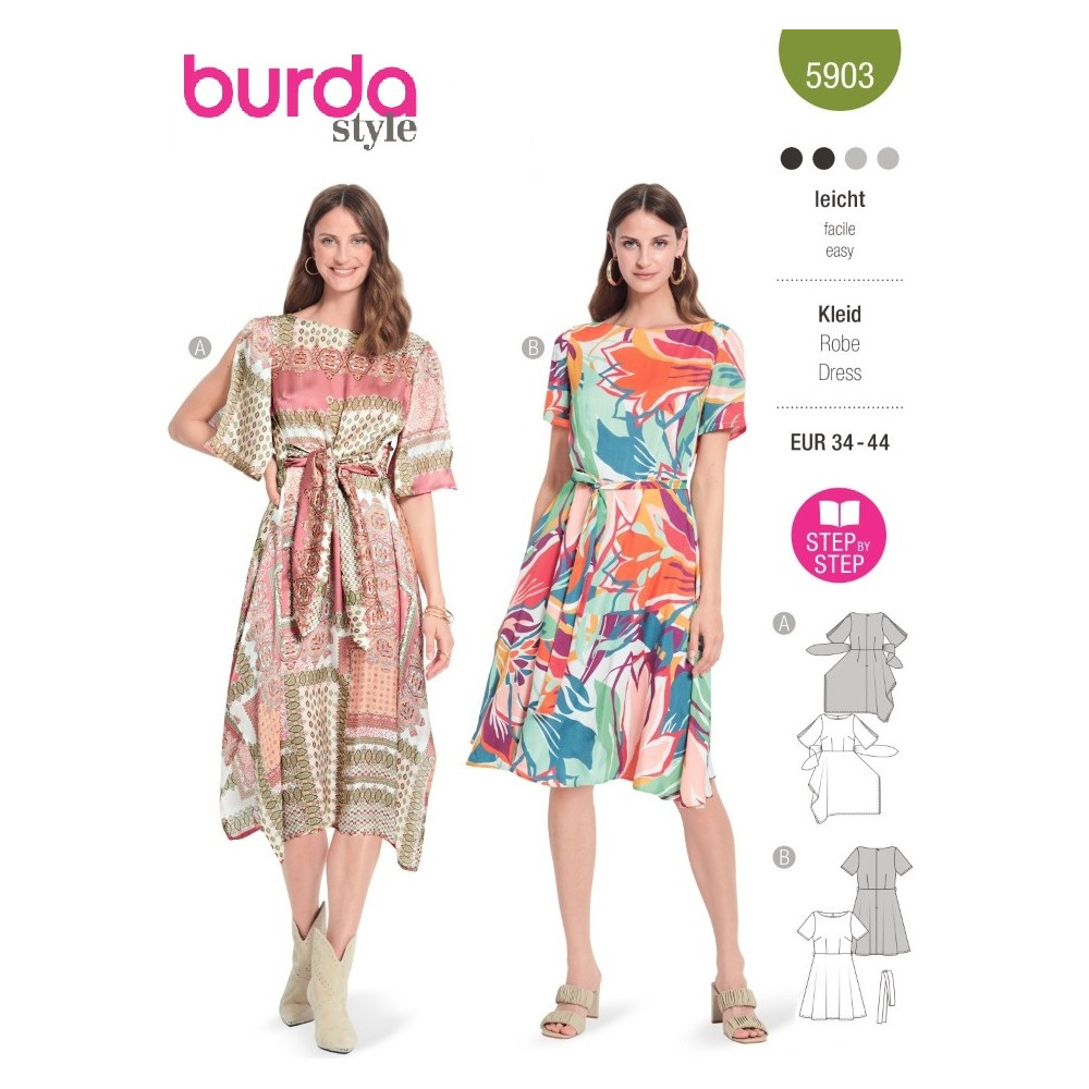 Střih ve velikostech EUR 34-44, úroveň obtížnosti šití: 2 lehká info, doporučené látky: bavlna, hedvábí, len
