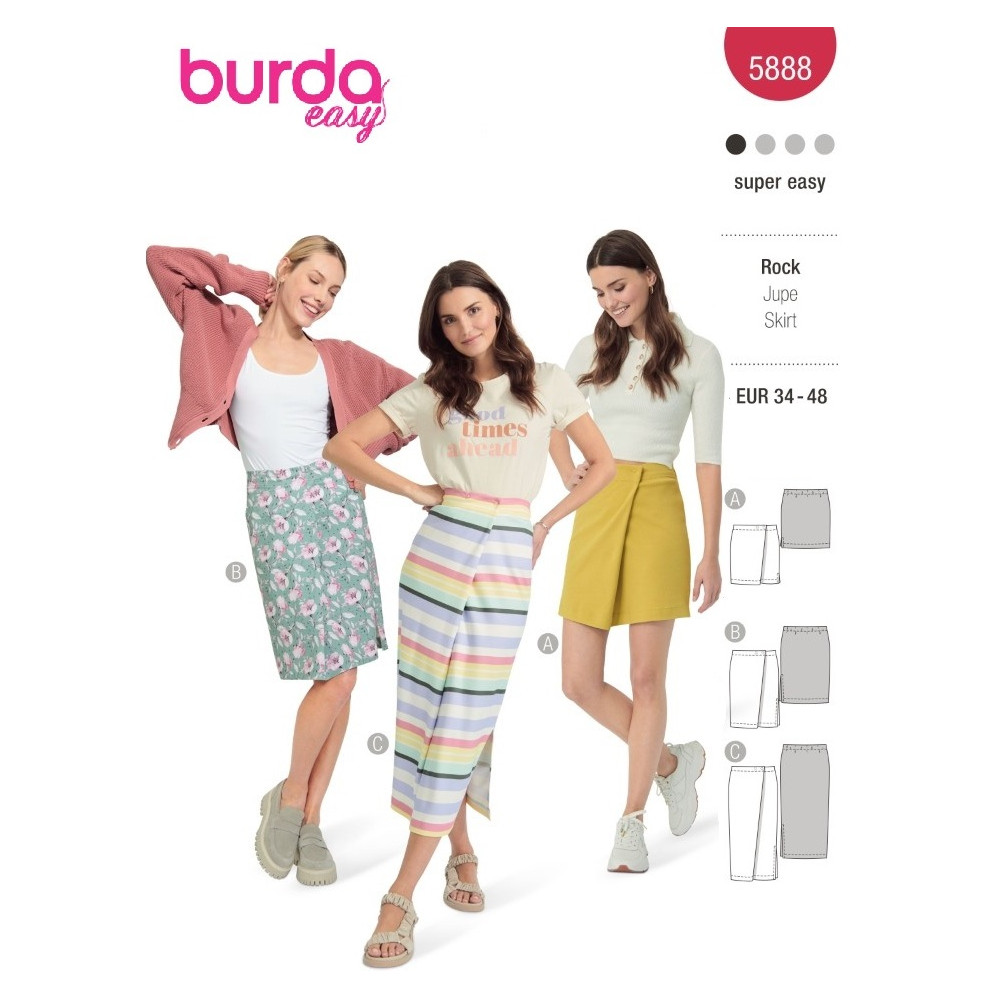 Střih ve velikostech EUR 34-48, úroveň obtížnosti šití: 1 velmi lehká info, doporučené látky: pouze strečové žerzejové látky