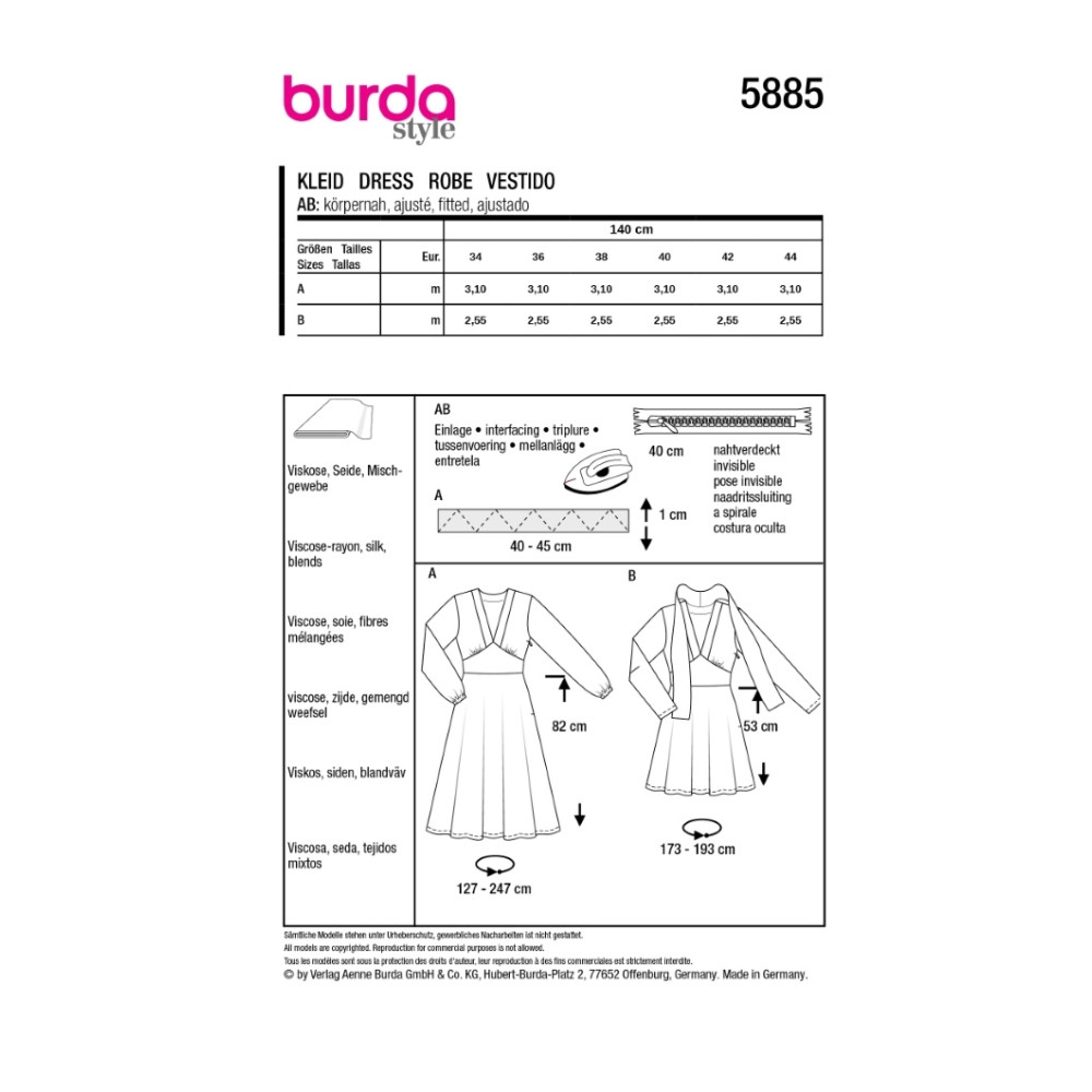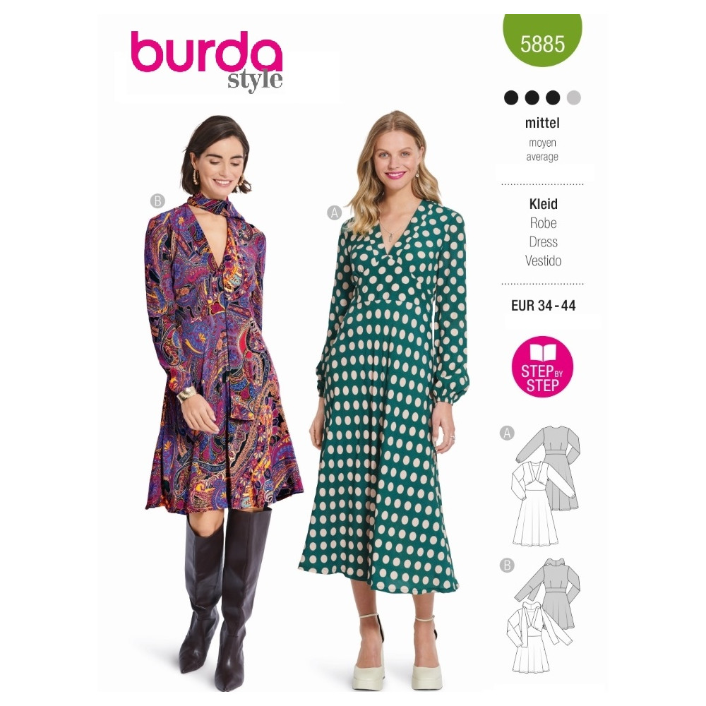 Střih ve velikostech EUR 34-44, úroveň obtížnosti šití: 3 střední info, doporučené látky: viskóza, hedvábí, směsové látky