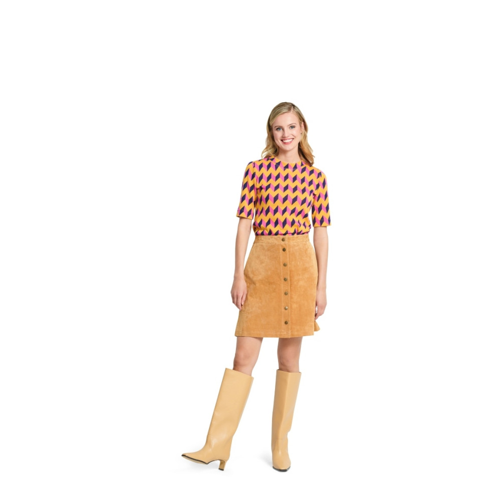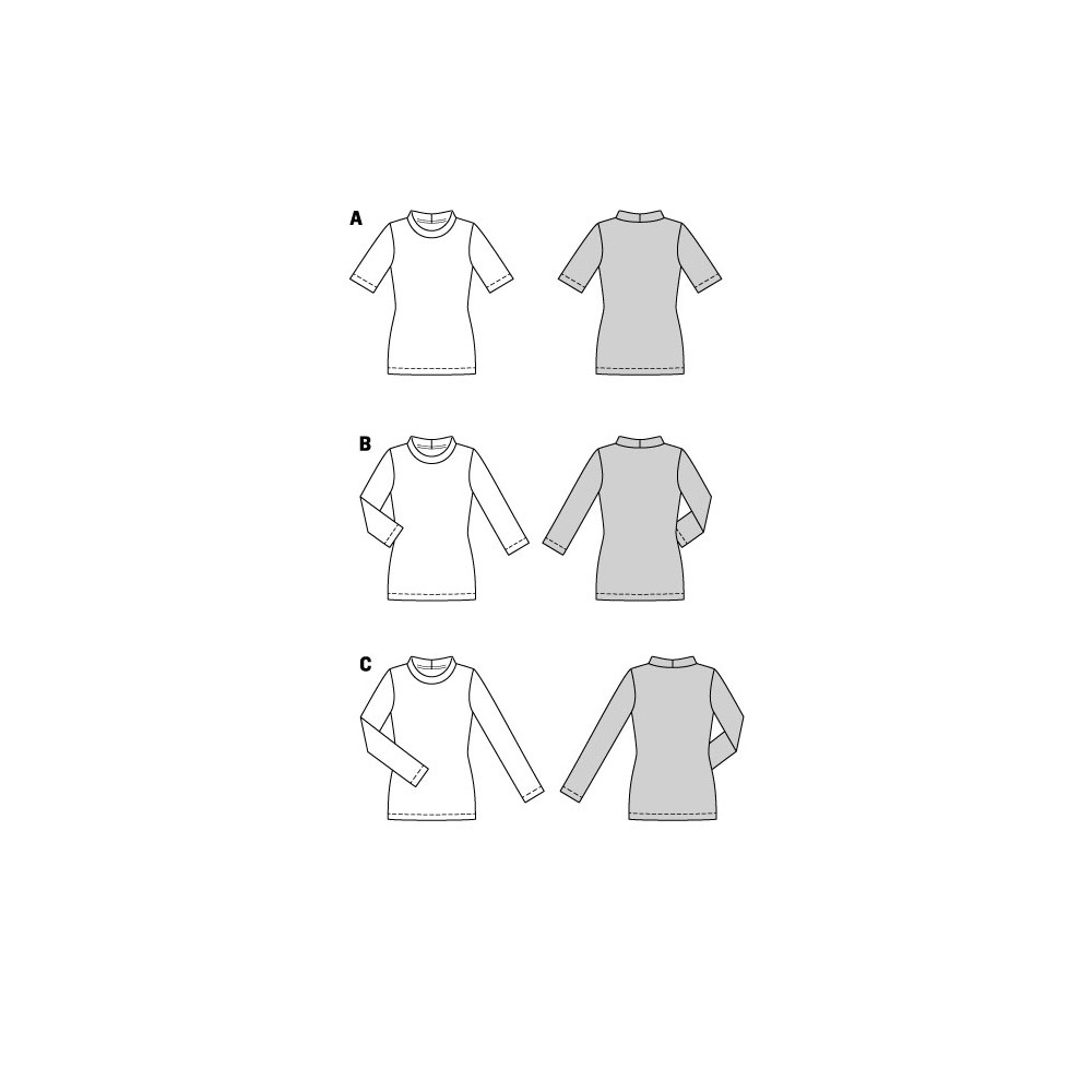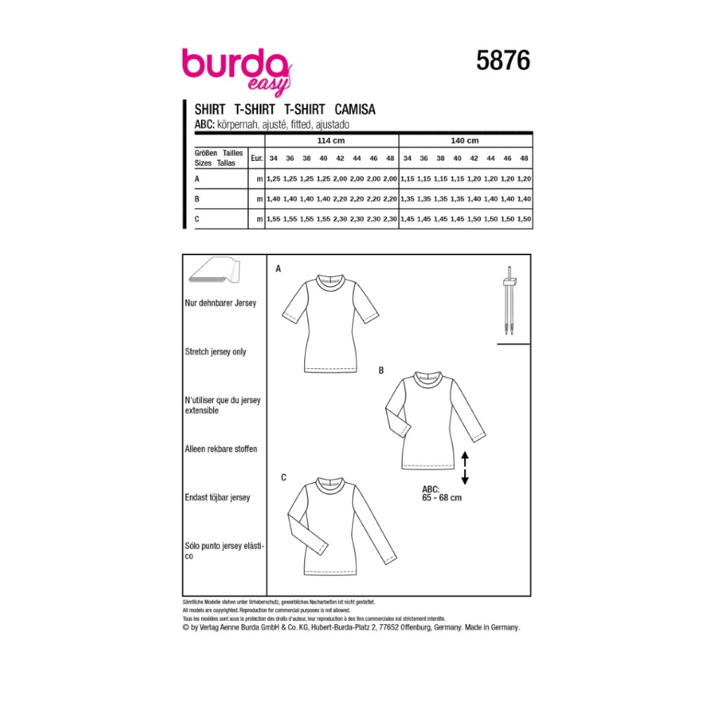 Střih ve velikostech EUR 34-48, úroveň obtížnosti šití: 1 velmi lehká info, doporučené látky: pouze elastický žerzej
