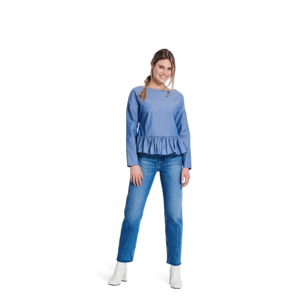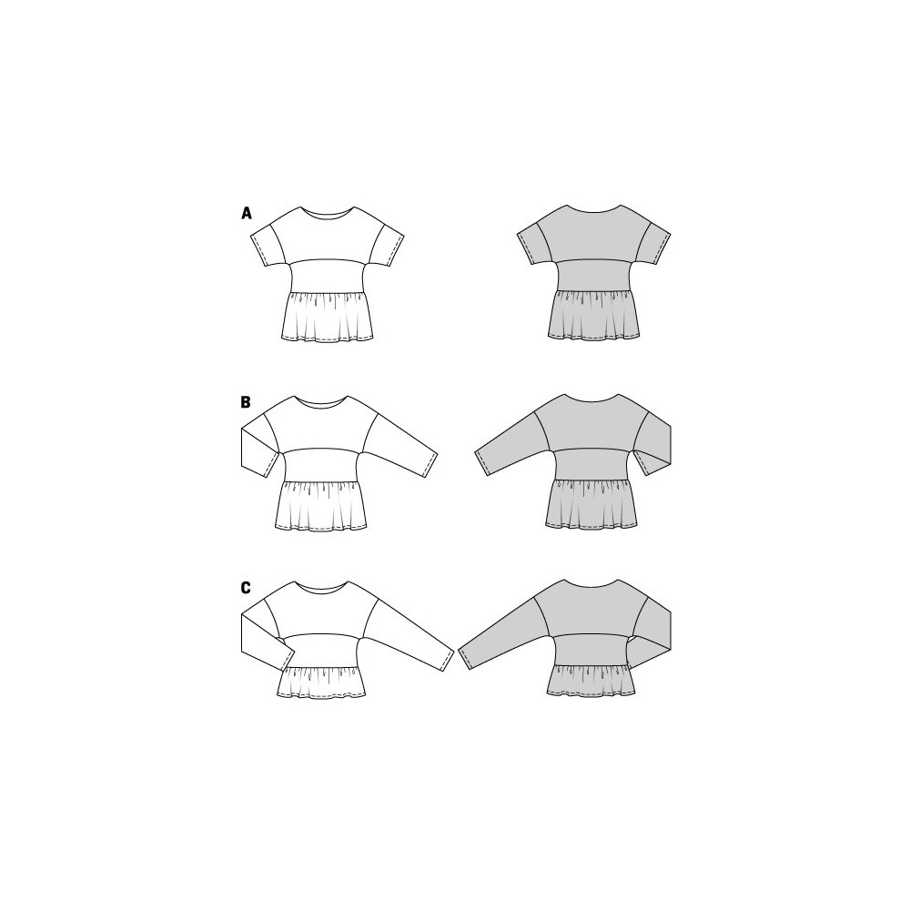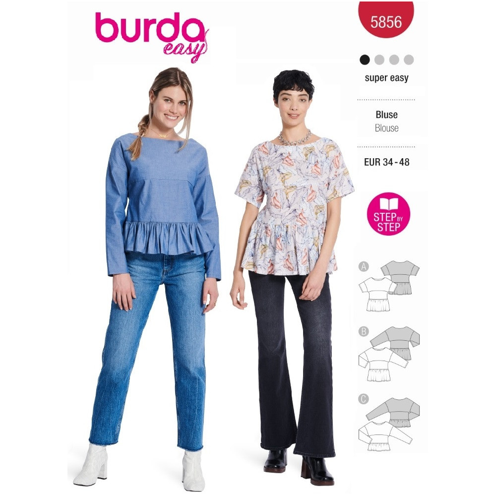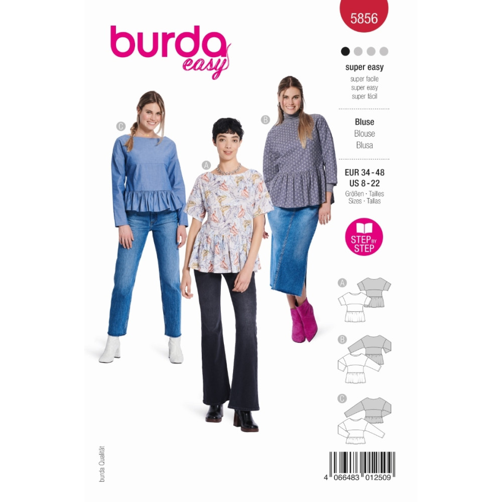 Střih ve velikostech EUR 34-48, úroveň obtížnosti šití: 1 velmi lehká info, doporučené látky: bavlna, směsové látky, viskóza, krepové látky