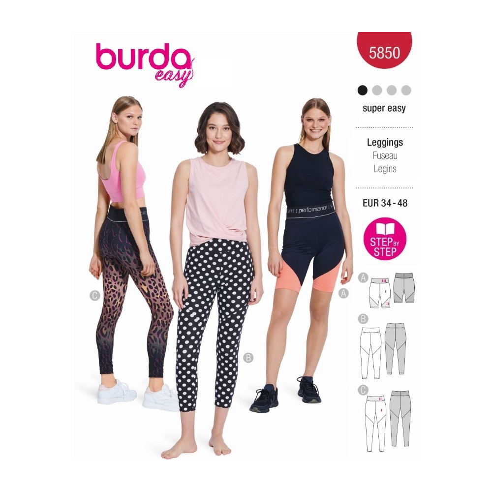 Střih ve velikostech EUR 34-48, úroveň obtížnosti šití: 1 velmi lehká info, doporučené látky: pouze bi-elastický žerzej s elastanem, funkční žerzej