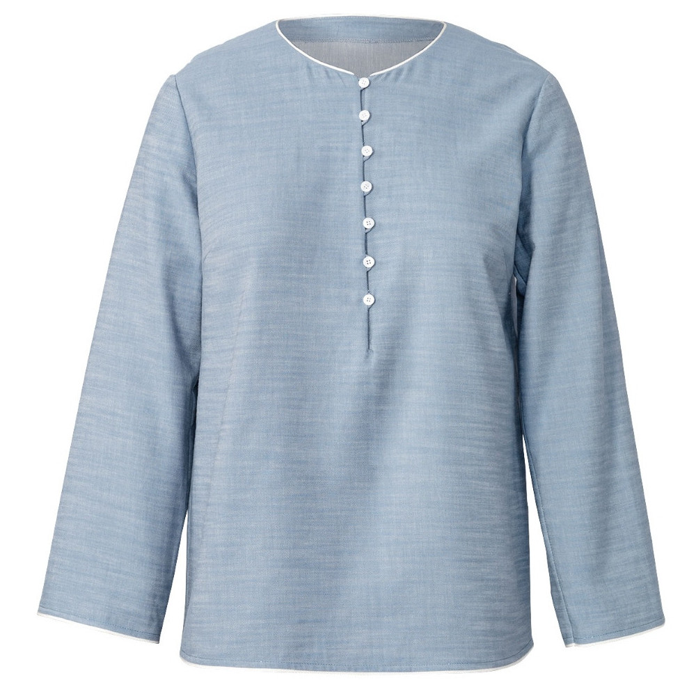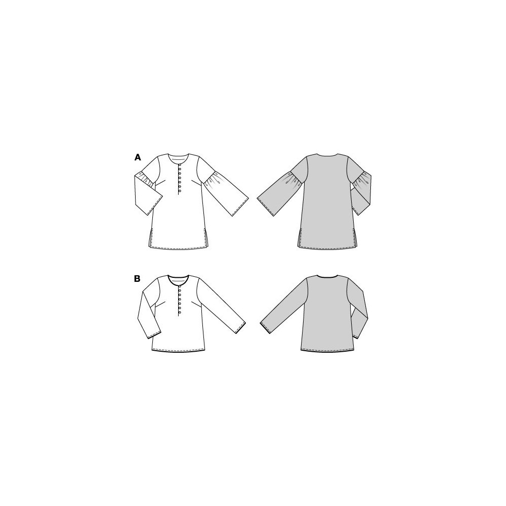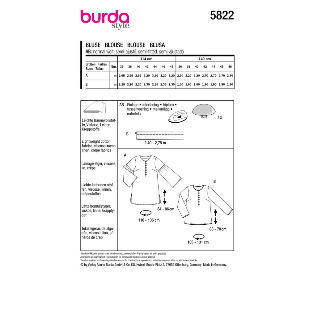 Střih ve velikostech EUR 36-48, úroveň obtížnosti šití: 3 střední info, doporučené látky: slabší bavlněné látky, viskóza, len, krepové látky
