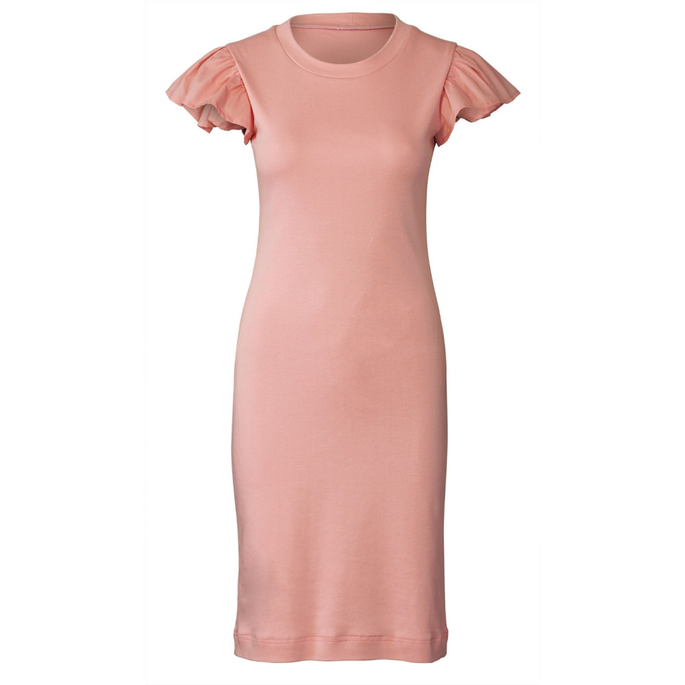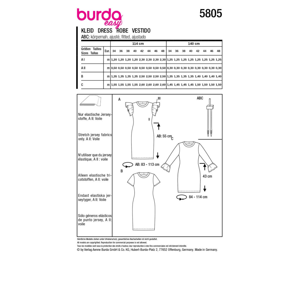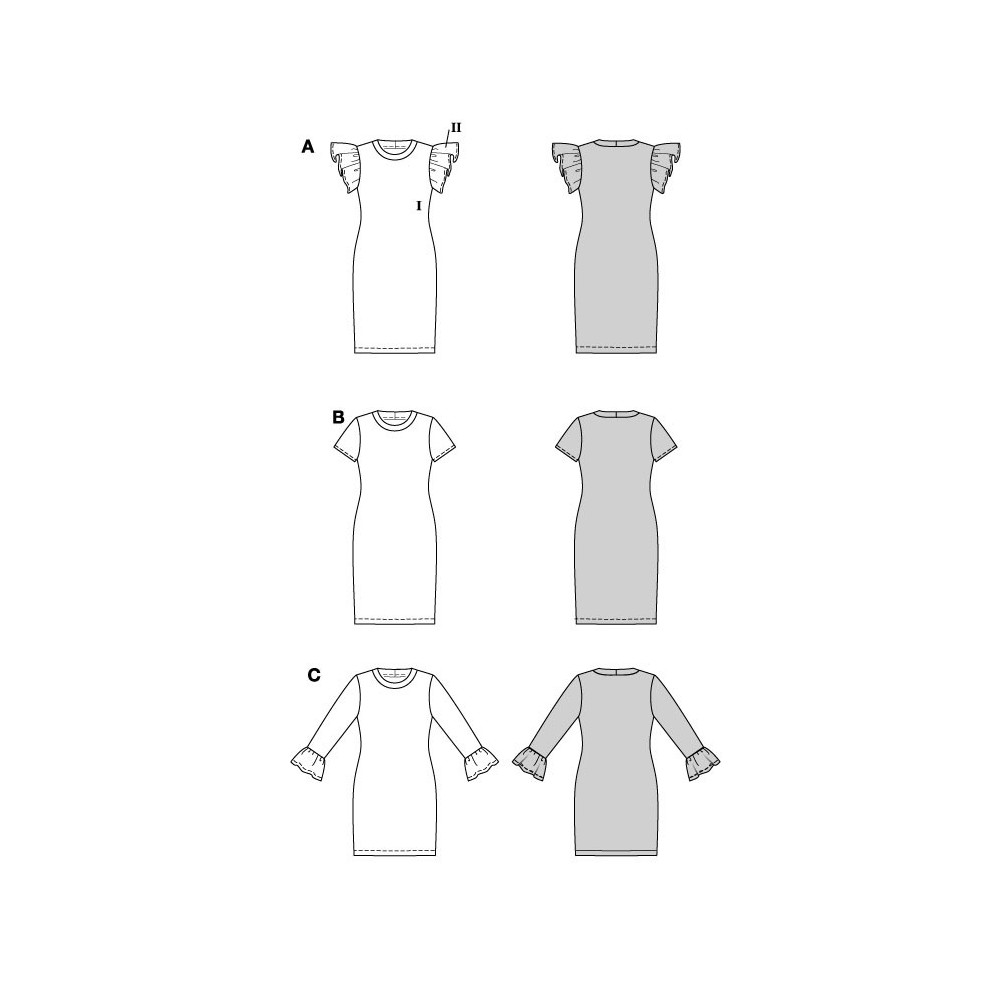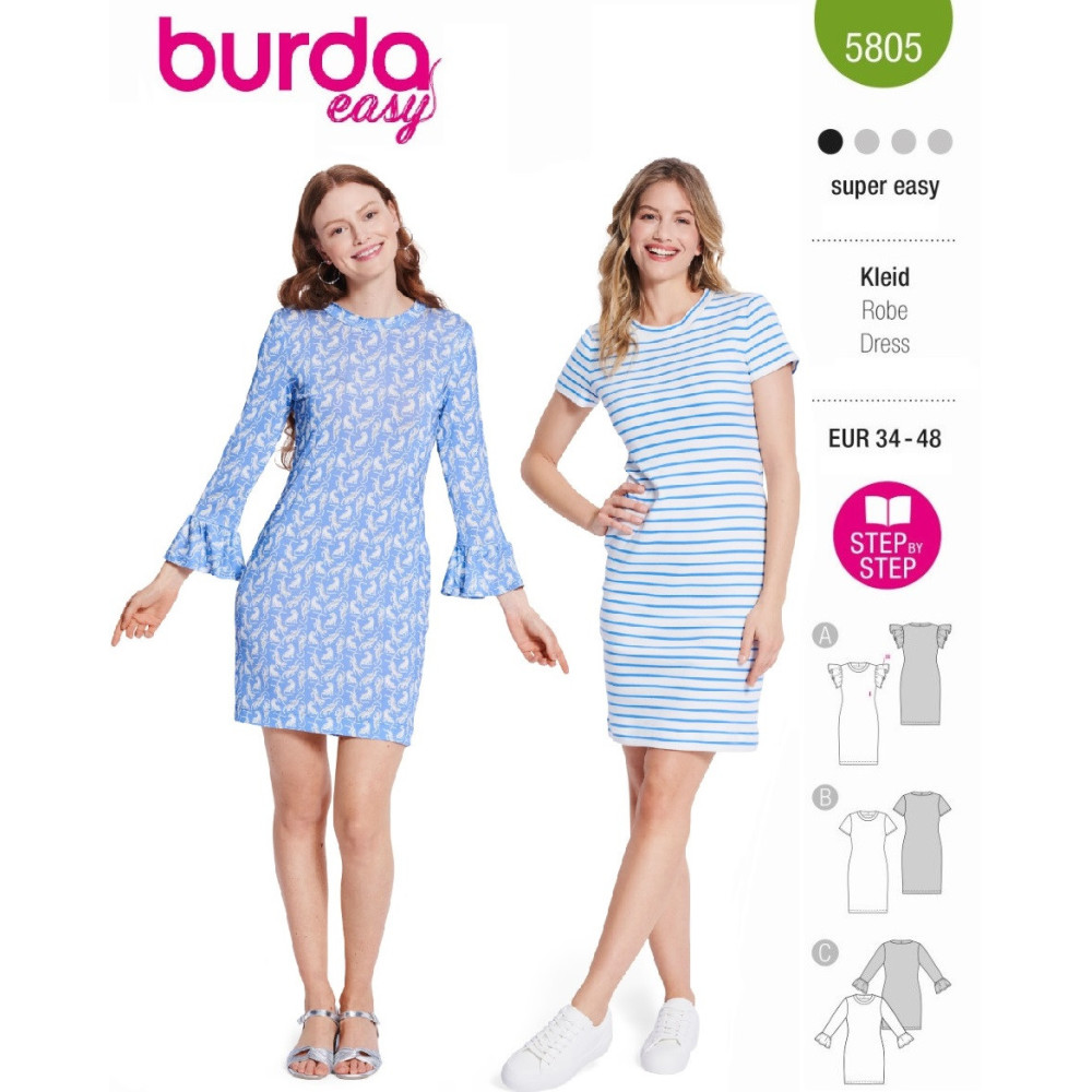 Jednoduchý střih Burda na rovné tričkové šaty s kulatým výstřihem a volánovými rukávy