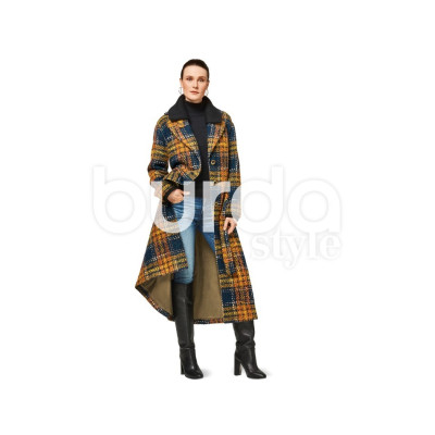 Střih Burda na volnější áčkový kabát ve dvou délkách s páskem a velkými kapsami.
