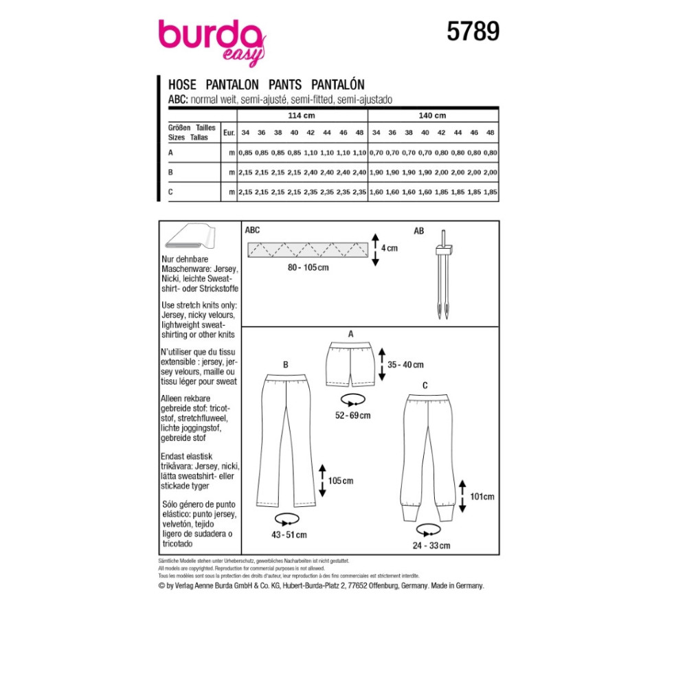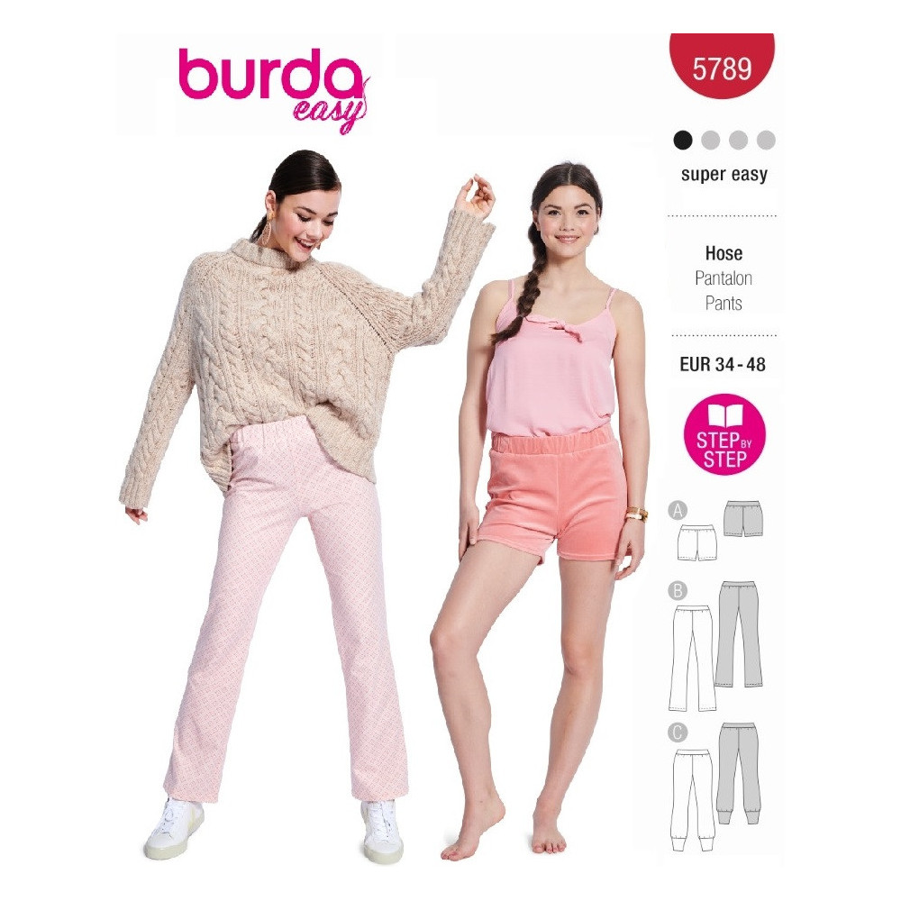 Jednoduchý střih Burda na kalhoty s rovnými nohavicemi a gumou v pase