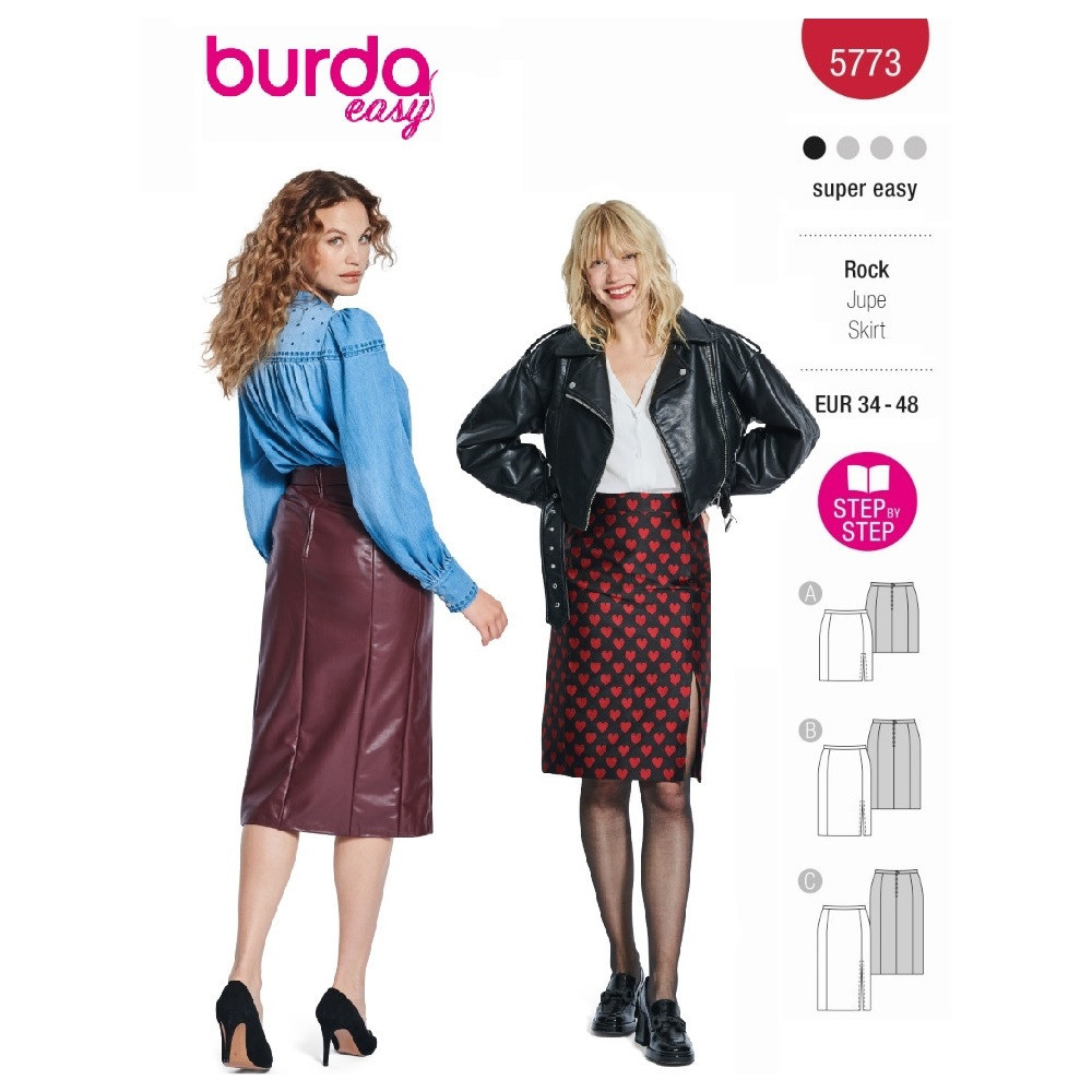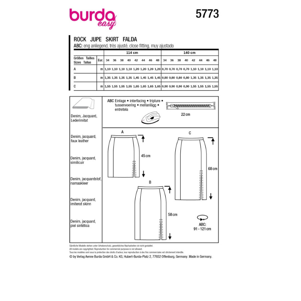 Střih ve velikostech EUR 36-48, úroveň obtížnosti šití: 1 velmi lehká info, doporučené látky: denim, žakár, koženka