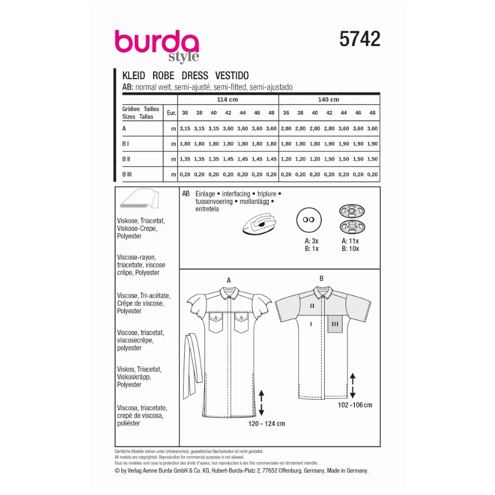Střih ve velikostech EUR 36-48, úroveň obtížnosti šití: 2 lehká info, doporučené látky: viskóza, tricetát, viskózový krep, polyester
