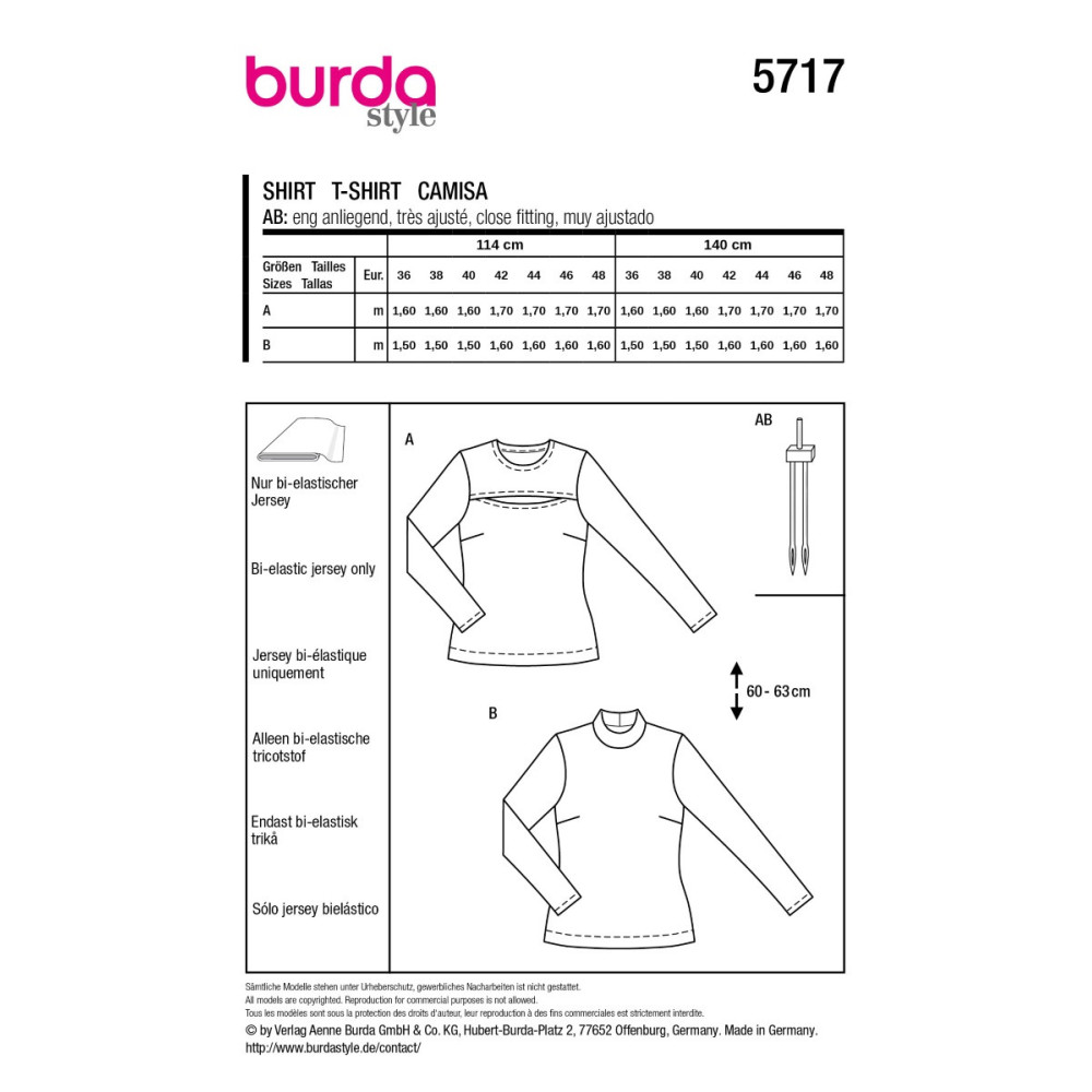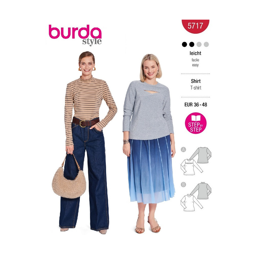 Střih ve velikostech EUR 36-48, úroveň obtížnosti šití: 2 lehká info, doporučené látky: bi-elastický žerzej