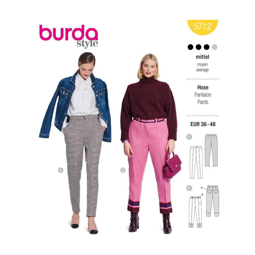 Střih Burda na tříčtvrteční kalhoty a rovné kalhoty se zažehlenými puky.