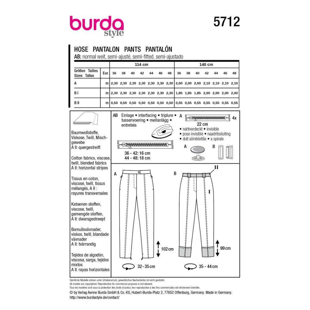 Střih ve velikostech EUR 36-48, úroveň obtížnosti šití: 3 střední info, doporučené látky: viskóza, bavlněné látky, twill, směsové látky