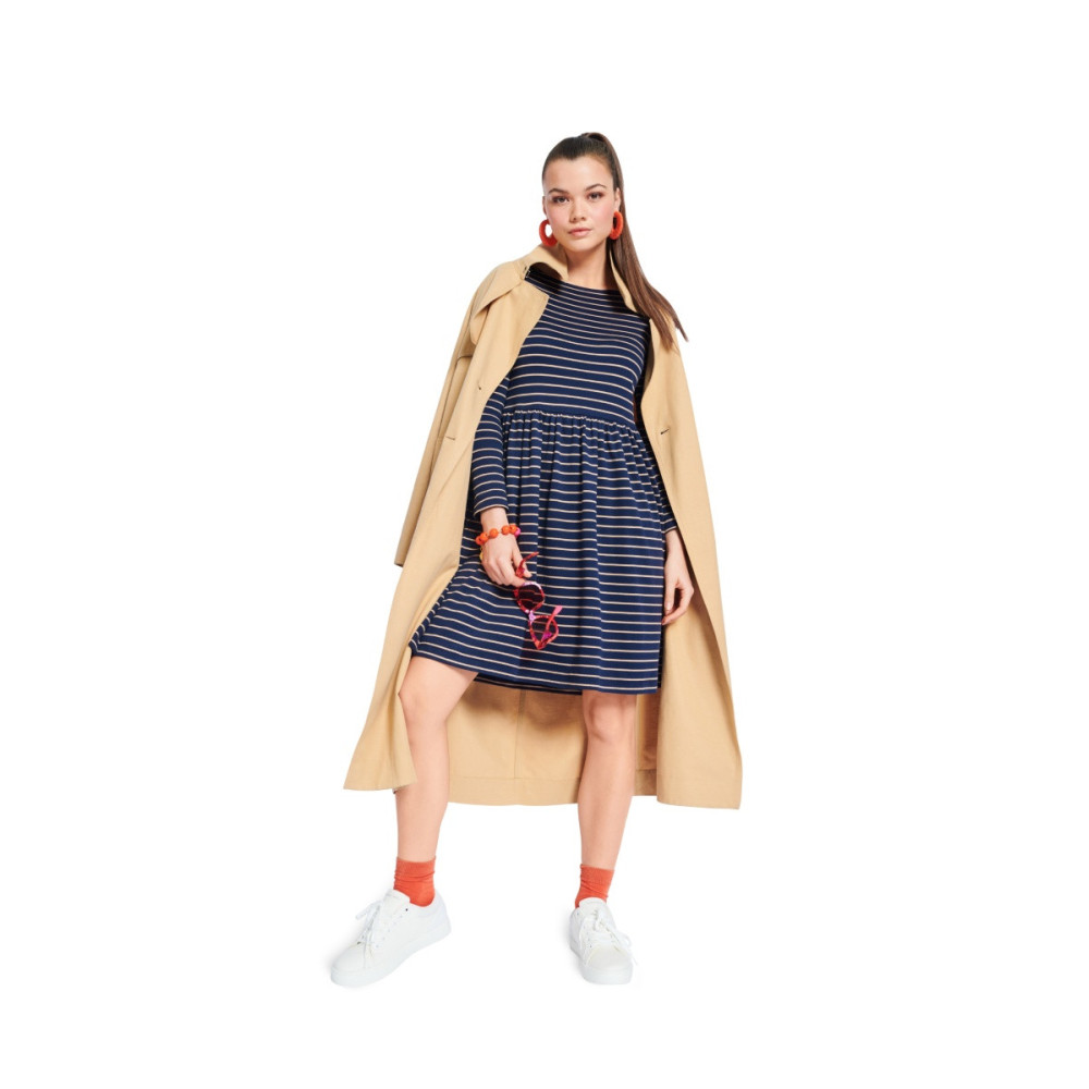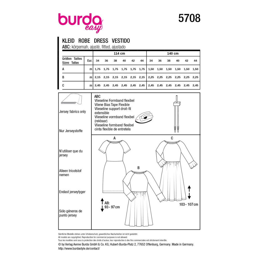 Střih ve velikostech EUR 34-44, úroveň obtížnosti šití: 1 velmi lehká info, doporučené látky: pouze žerzejové látky