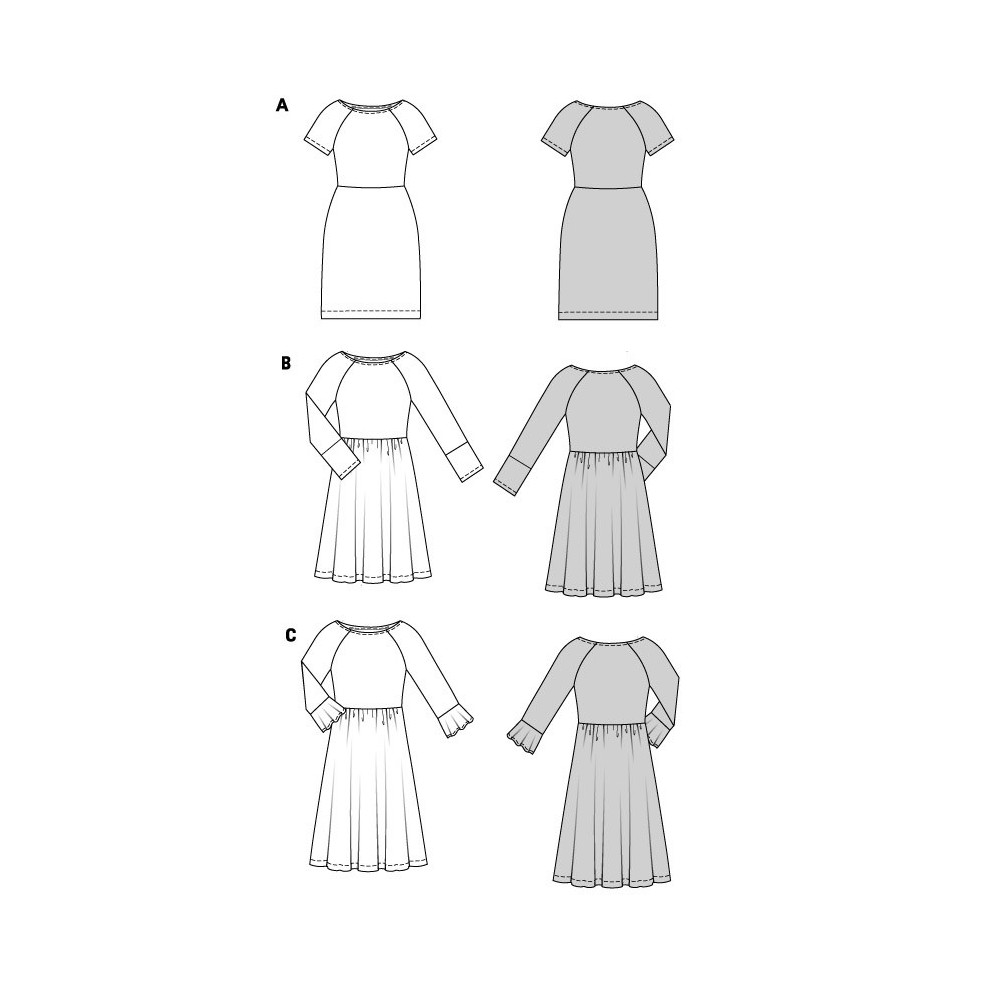 Technický výkres s různými variantami střihu - např. různé varianty a délky rukávů, různé tvary sukně, límce, kapes atd.