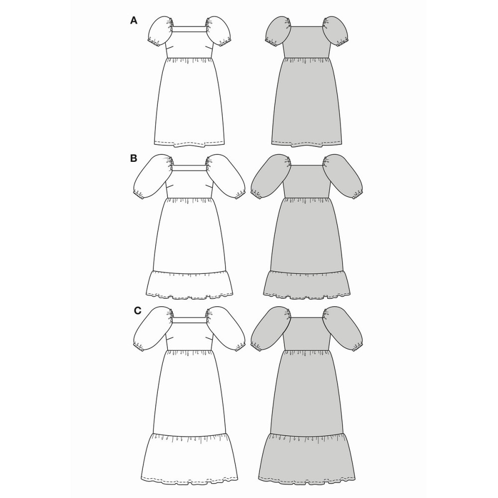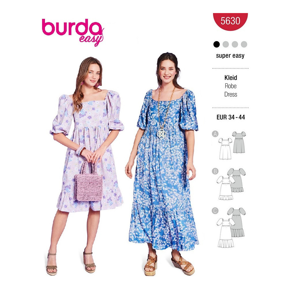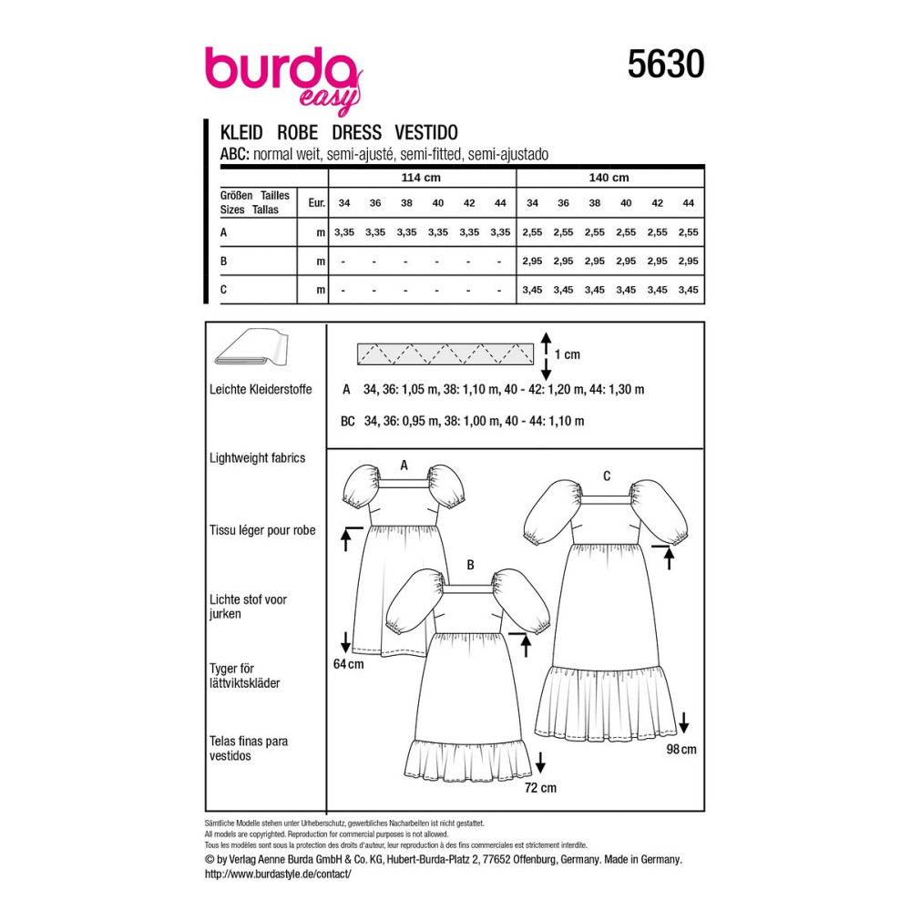 Střih ve velikostech EUR 34-44, úroveň obtížnosti šití: 1 velmi lehká info, doporučené látky: slabší šatovky