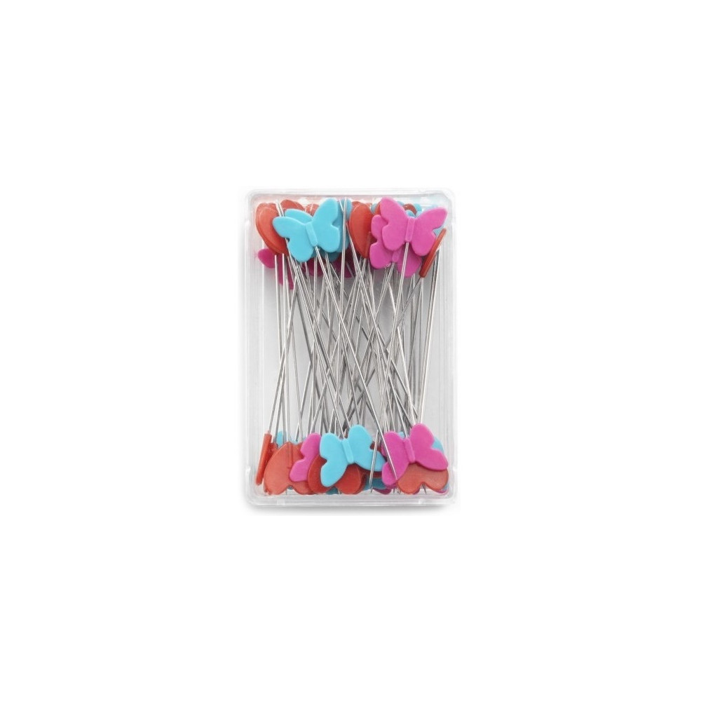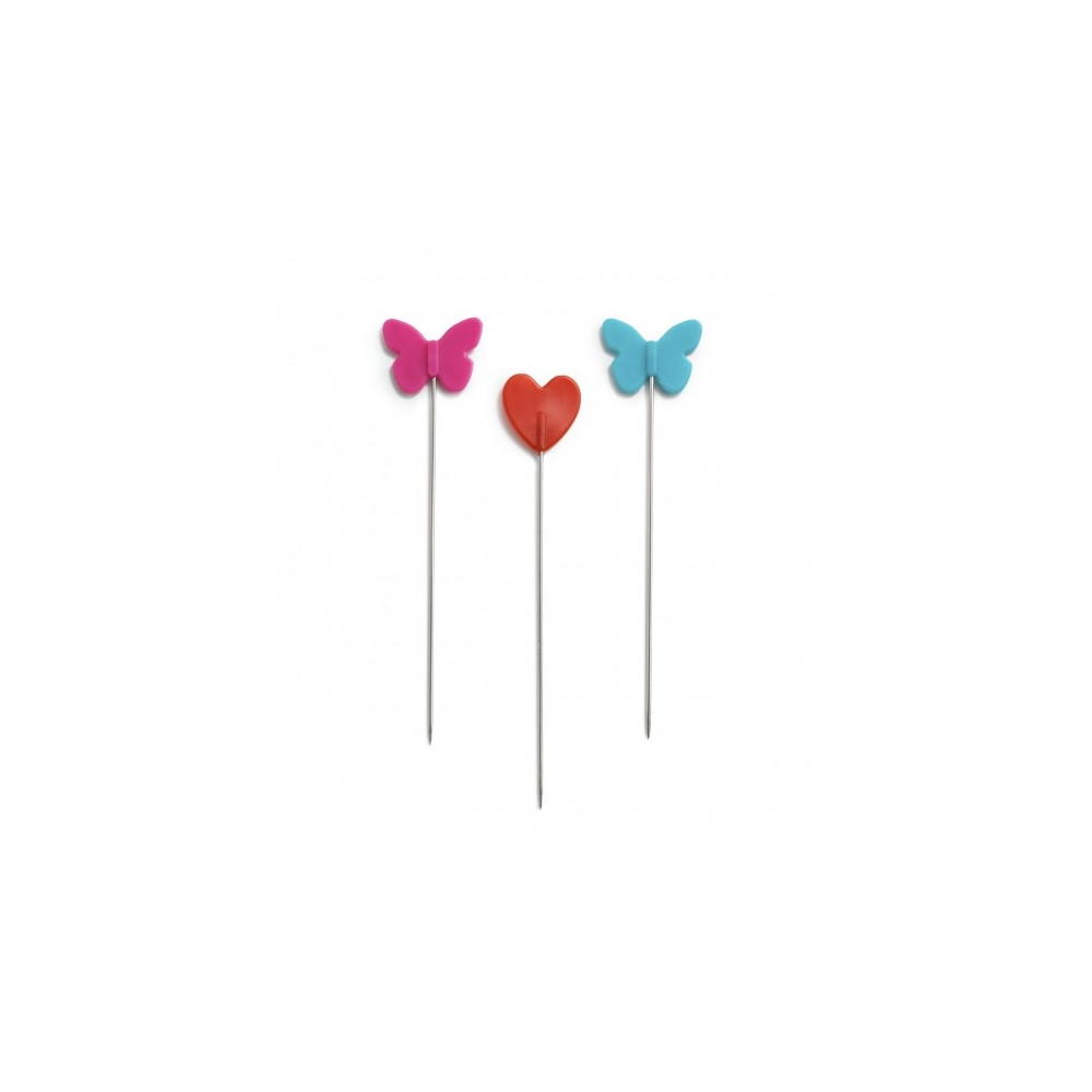 Více se dočtete v popisuPraktické 5 cm dlouhé špendlíky vyrobené z nerezové oceli jsou ozdobené plastovou hlavičkou ve tvaru motýlků a srdíček, díky nimž se špendlíky snadno a dobře uchopují a drží. Jemná ostrá špička špendlíků snadno pronikne i několika vrstvami látky, aniž by poničila její vlákna.