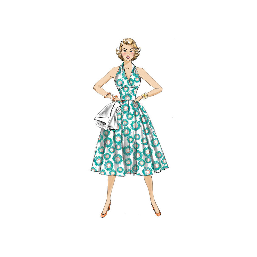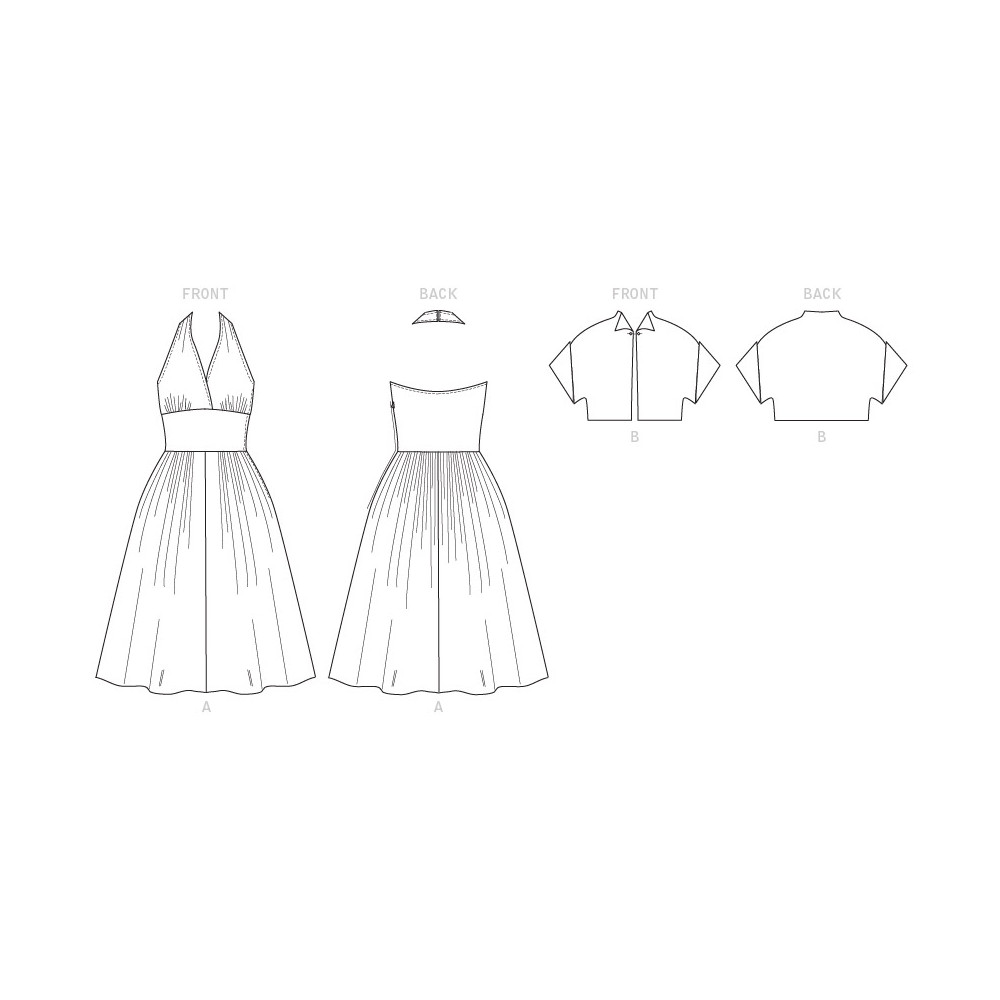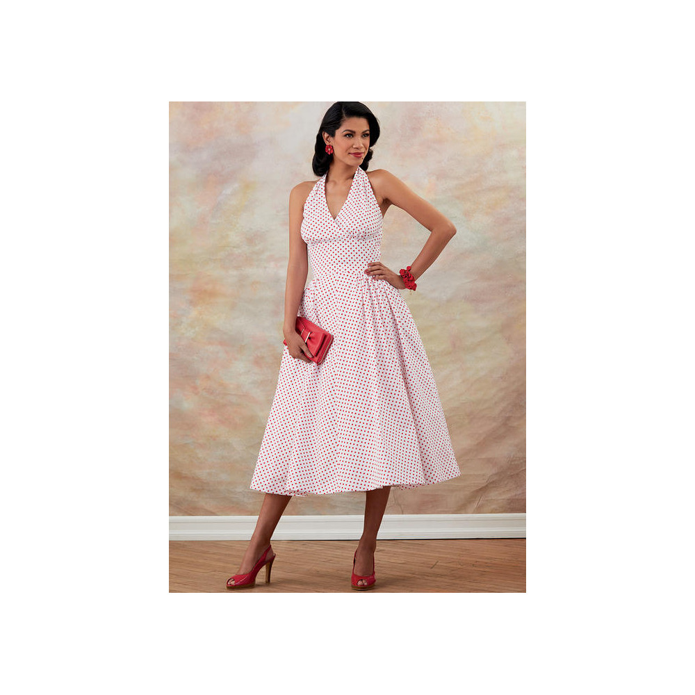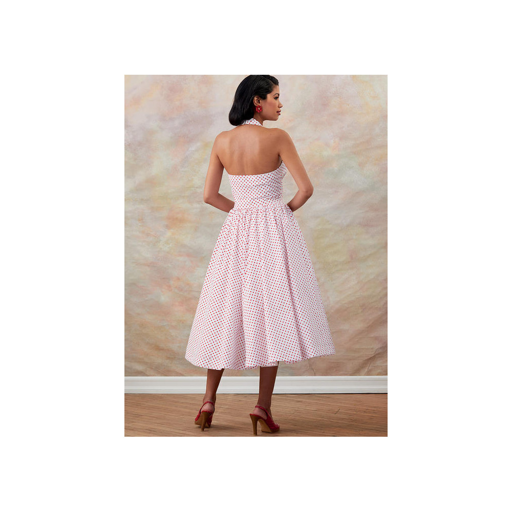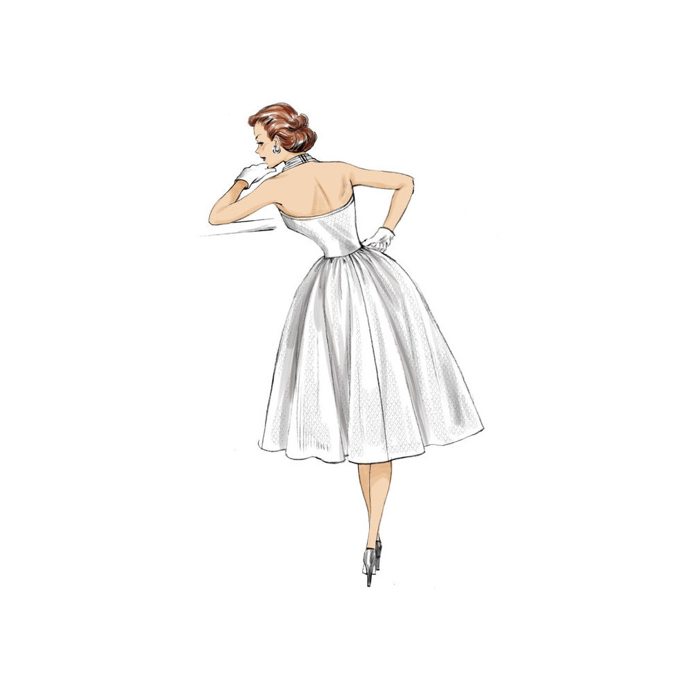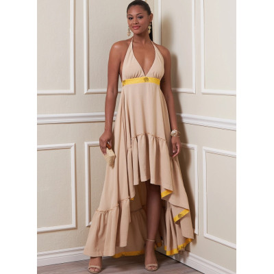 Návrhářský střih Vogue na šaty v empírové linii, s ramínky za krk, V-výstřihem, nahými zády a...