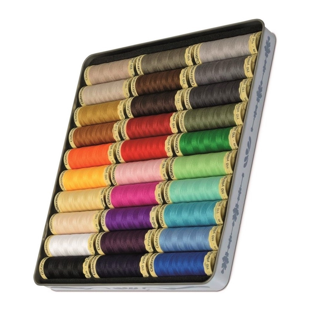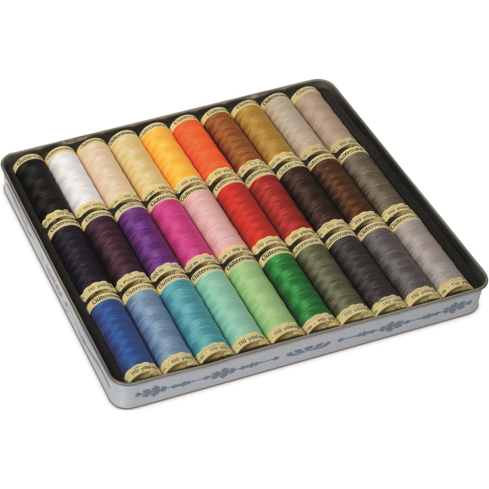 Bonusová sada / dárkové balení 30 špulek univerzálních šicích nití Gütermann (100% polyester) v návinu 100 m v základních barvách. Plechová dóza "Vintage" s nostalgickým motivem z roku 1930 ZDARMA.