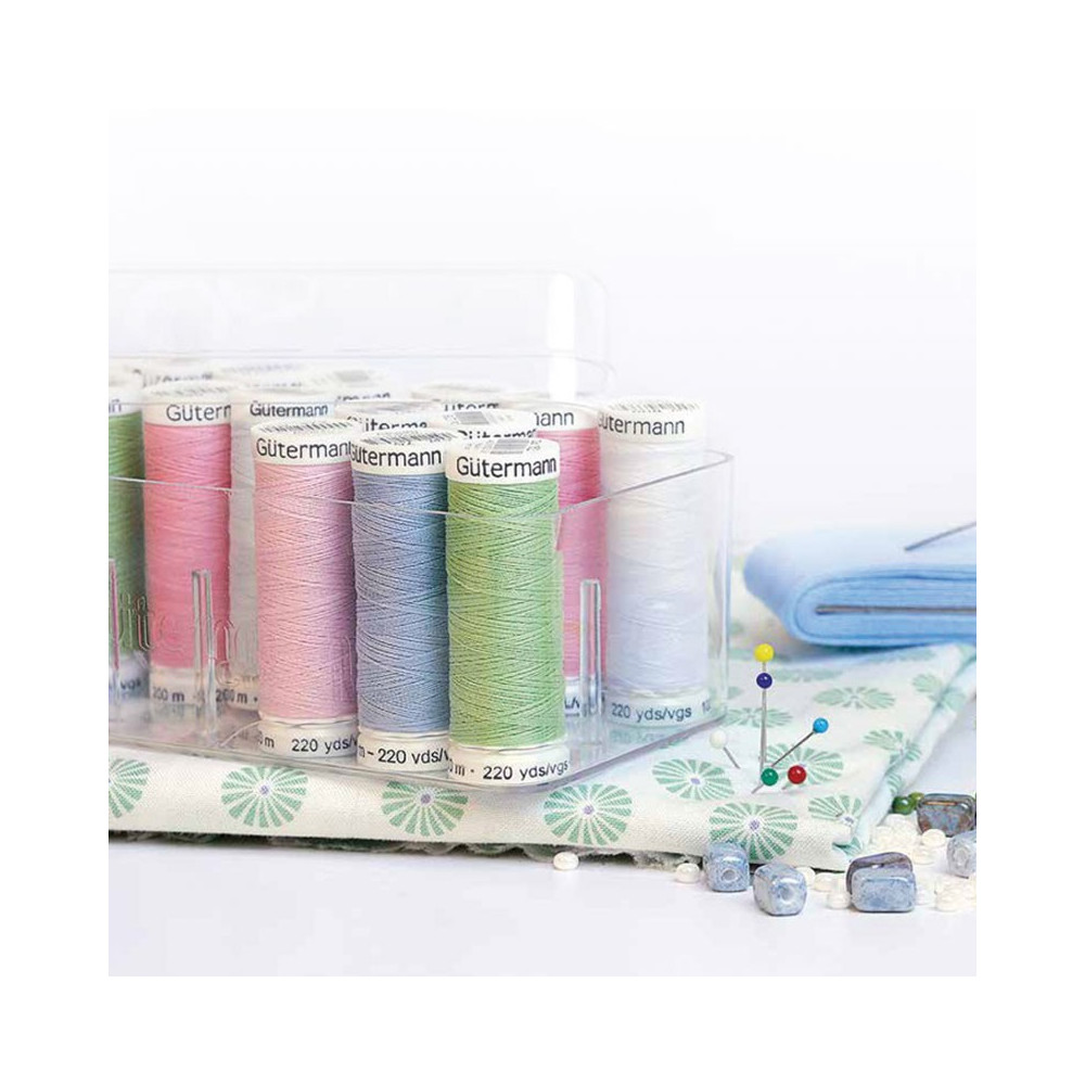Více se dočtete v popisuTransparentní plastový box s víkem na uložení a organizaci nití. Pasují do něj všechny špulky nití Gütermann do průměru 19 mm. Rozměr: 200 x 62 x 78 mm