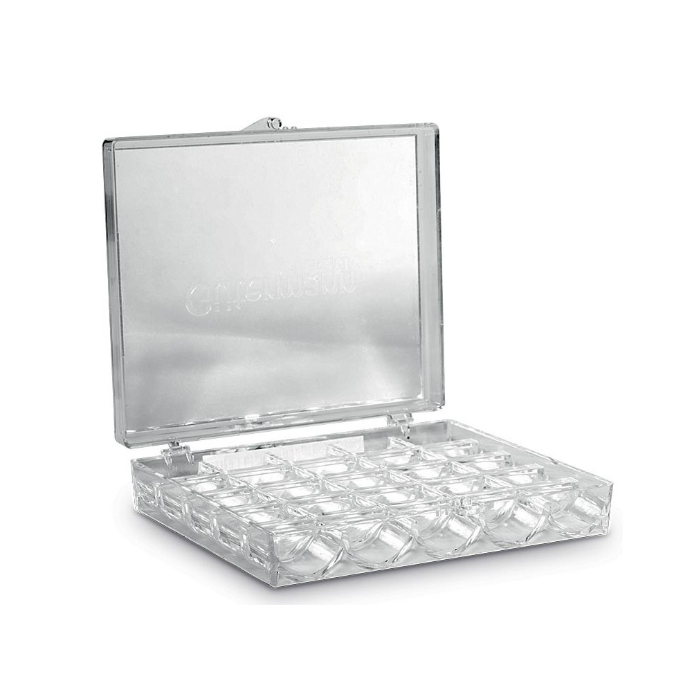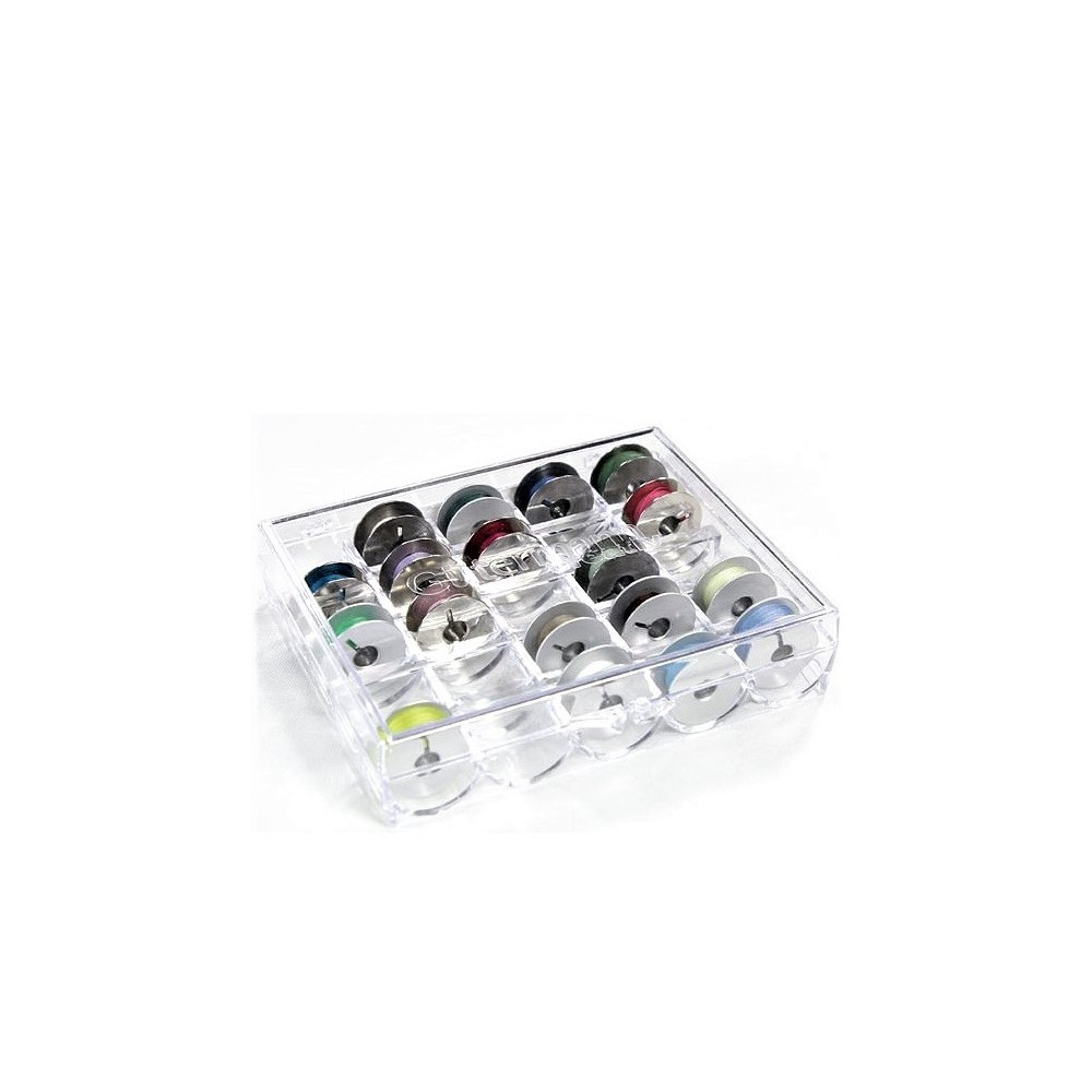 Více se dočtete v popisuTransparentní plastový box s víkem na uložení a organizaci spodních cívek s nitěmi. Rozměr: 122 x 27 x 109 mm