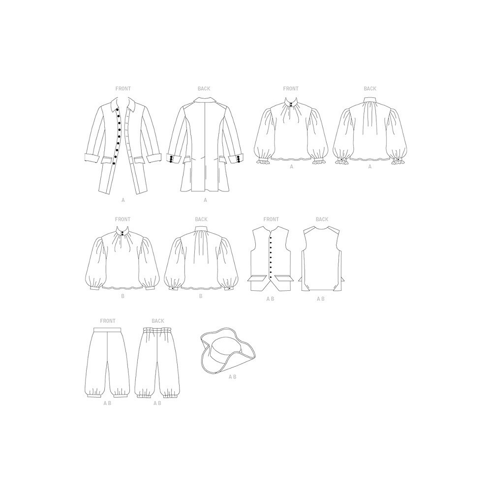 Střih Butterick na pánský historický kabát a vestu s jednořadým zapínáním, košili, kalhoty a klobouk