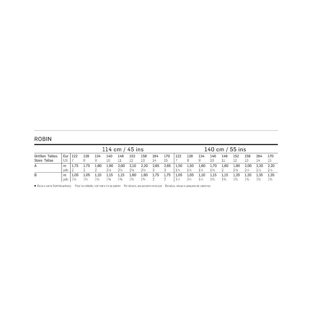 Doporučené látky a tabulka se spotřebou látek pro více velikostí a různé šíře látek (114 cm a 140 cm)
