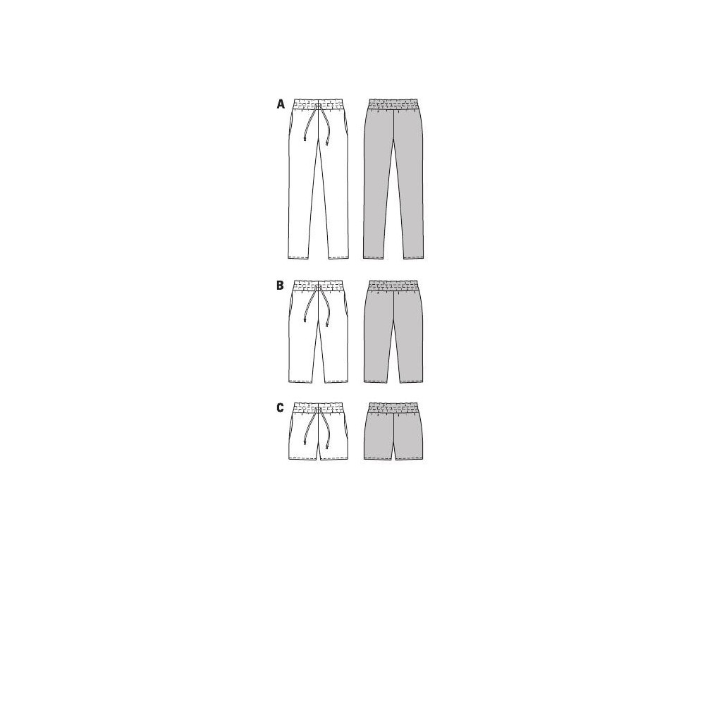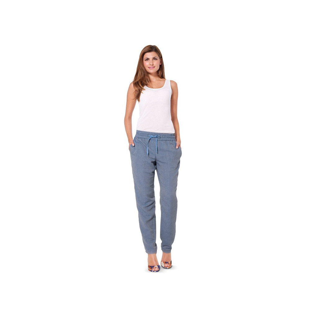 Střih Burda na jednoduché kalhoty v různých délkách se širokým pasem do gumy.