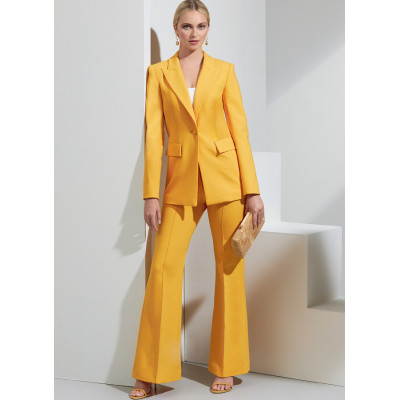 Střih Vogue na dámský kalhotový kostým s prodlouženým sakem a kalhoty s vysokým pasem a zvonovými...