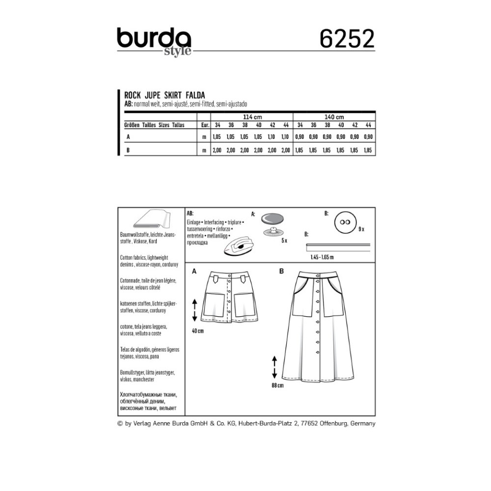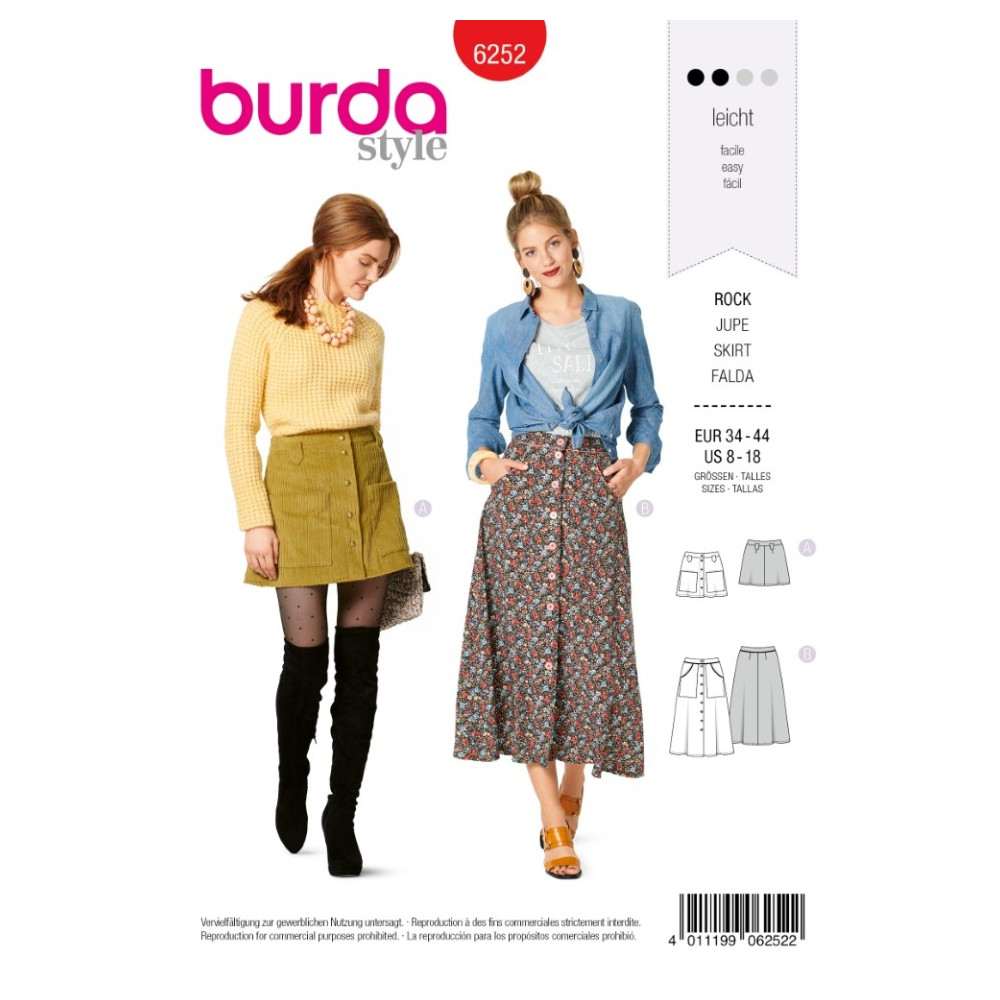Střih ve velikostech EUR 34-44, úroveň obtížnosti šití: 2 (lehká), doporučené látky: bavlna, lehčí džínovina, viskóza, manšestr