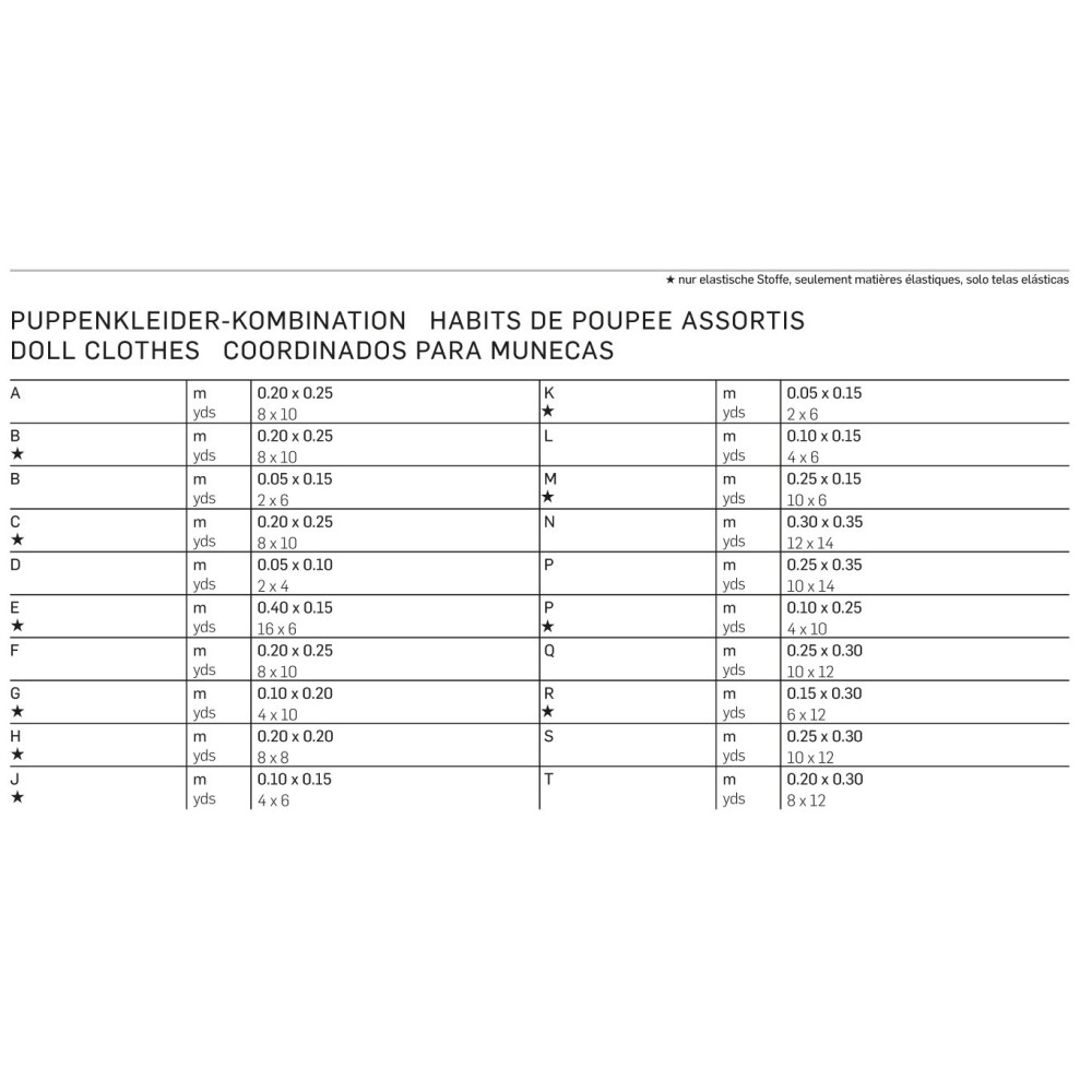 Doporučené látky a tabulka se spotřebou látek pro více velikostí a různé šíře látek (114 cm a 140 cm)