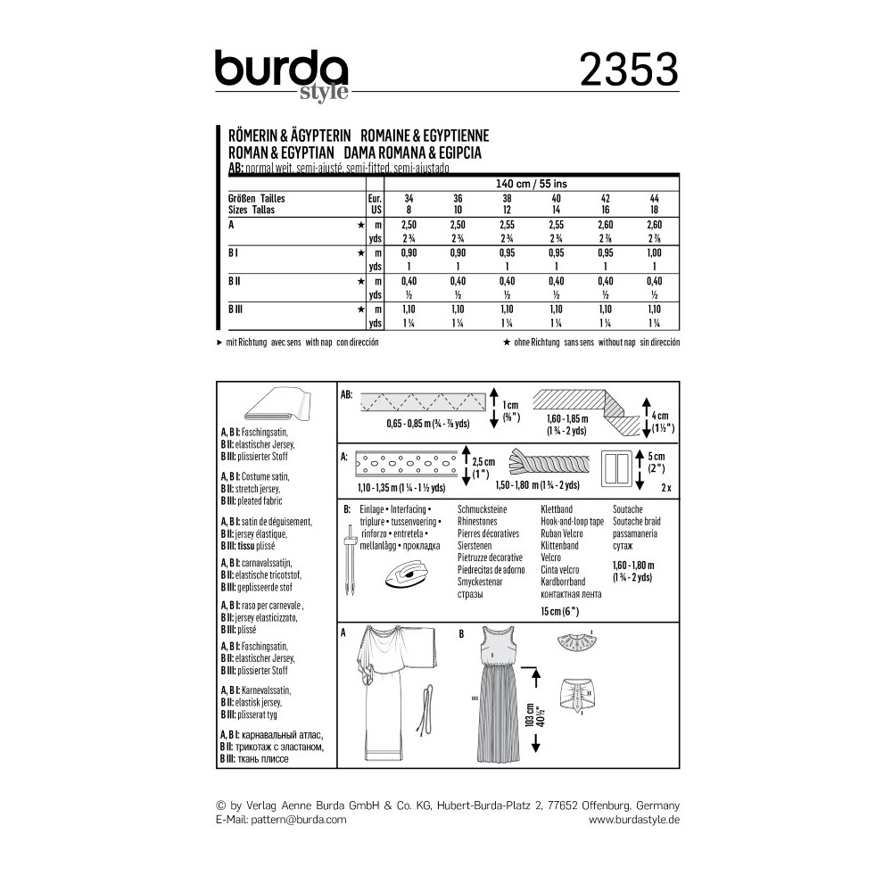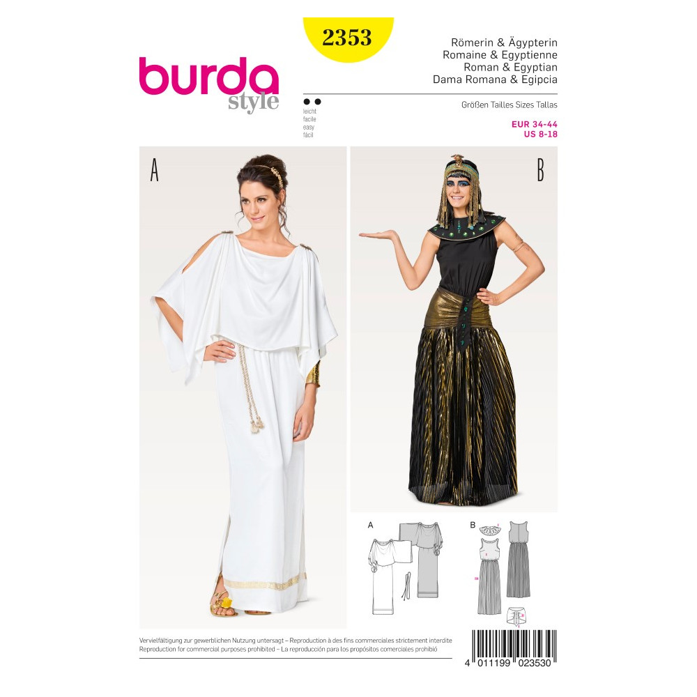 Střih ve velikostech EUR 34 - 44, úroveň obtížnosti šití: 2 (lehká), doporučené látky: karnevalový satén, žerzej, plisované látky