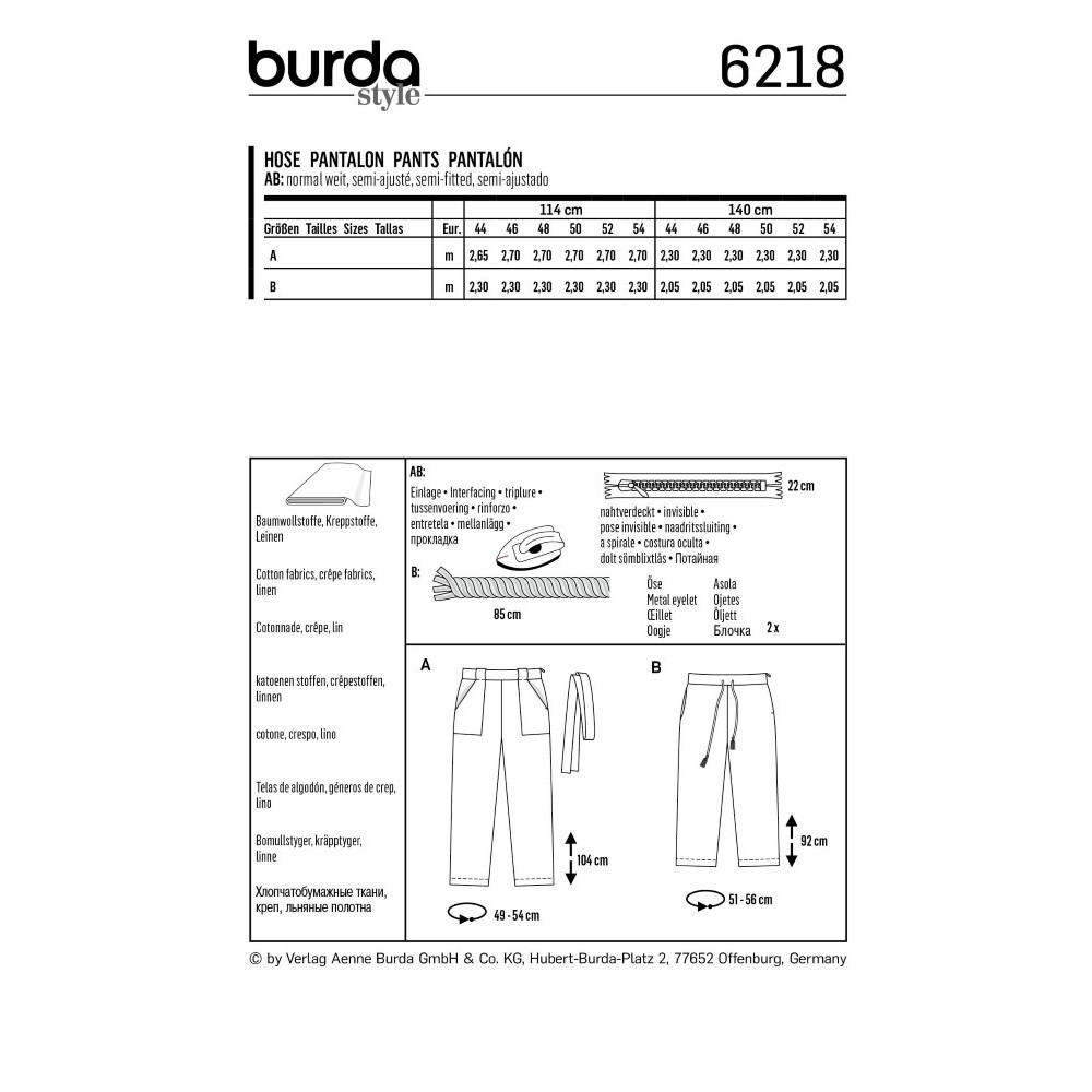 Střih ve velikostech EUR 44-54, úroveň obtížnosti šití: 2 (lehká), doporučené látky: bavlna, krepové látky, len