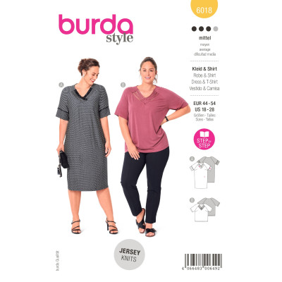 Střih Burda na rovné šaty a tričko se zdobeným V-výstřihem a krátkým rukávem