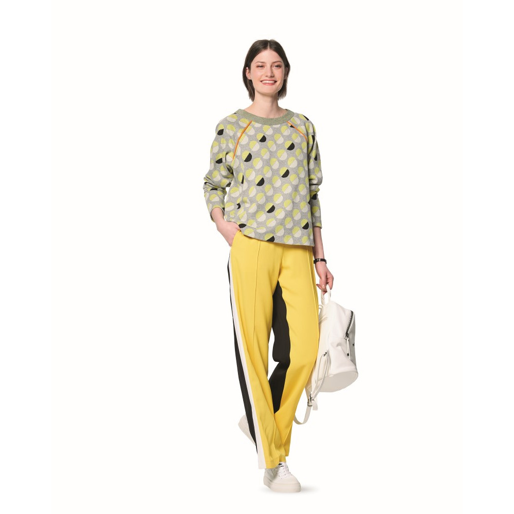 Střih Burda na pohodlné teplákové kalhoty s pružným pasem se šňůrkou nebo s nápletem.