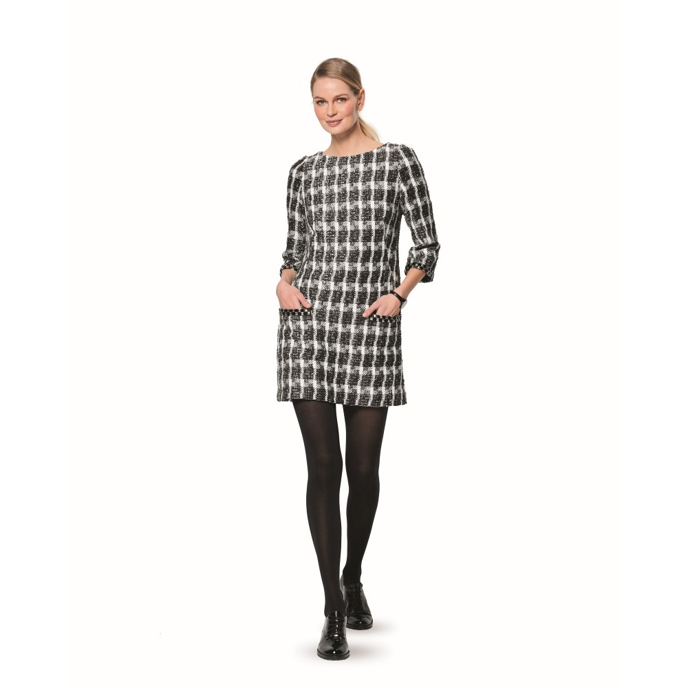 Střih ve velikostech EUR 34-44, úroveň obtížnosti šití: 2 (lehká), doporučené látky: lehčí vlněné látky, žakár, směsové látky