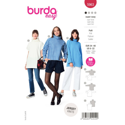 Jednoduchý střih Burda na volnou mikinu (2 délky) s vysokým rolákovým límcem