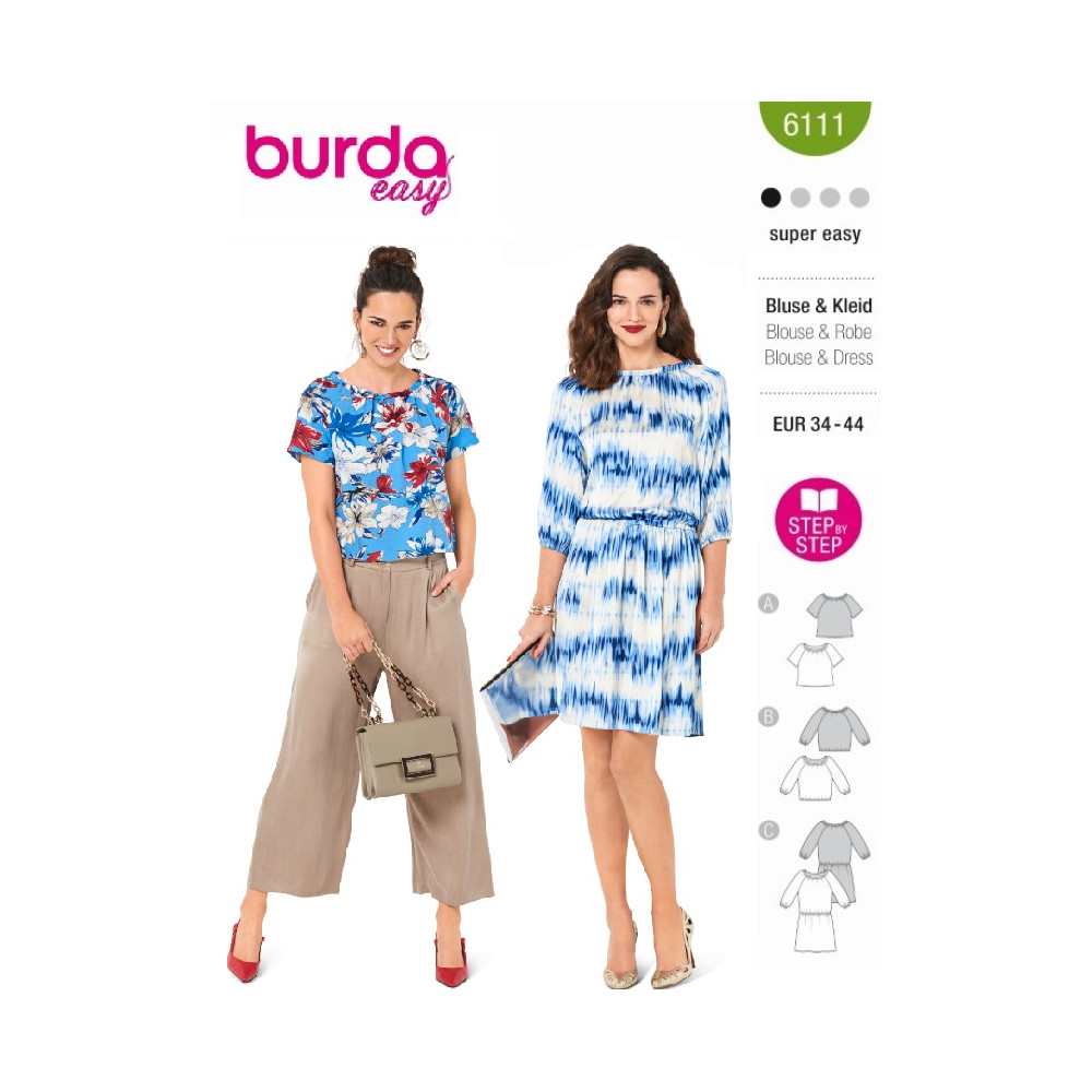 Střih ve velikostech EUR 34-44, úroveň obtížnosti šití: 1 (velmi lehká), doporučené látky: viskóza, krepové látky, lehčí bavlna, hedvábí