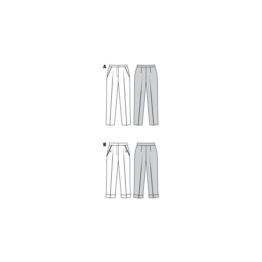 Střih Burda na kalhoty se širokými nohavicemi, vysokým pasem se sklady a kapsami.