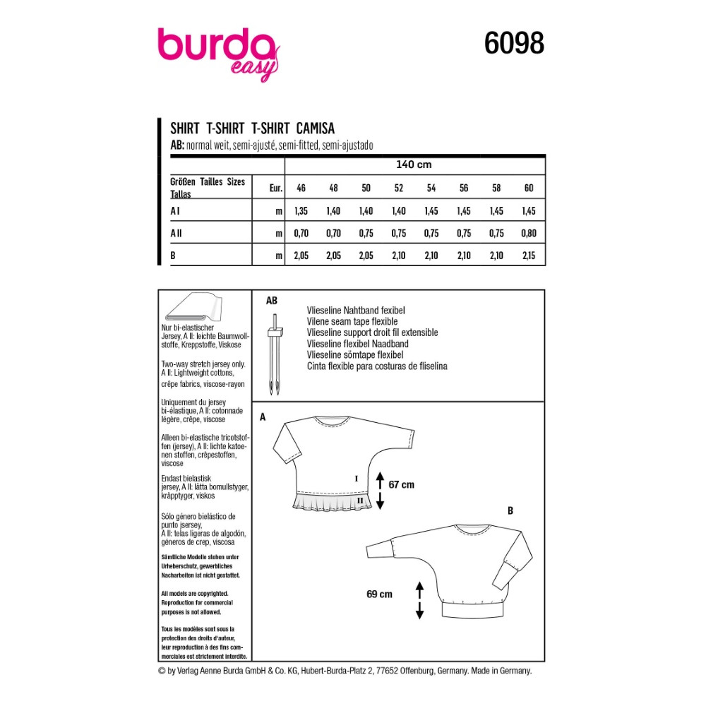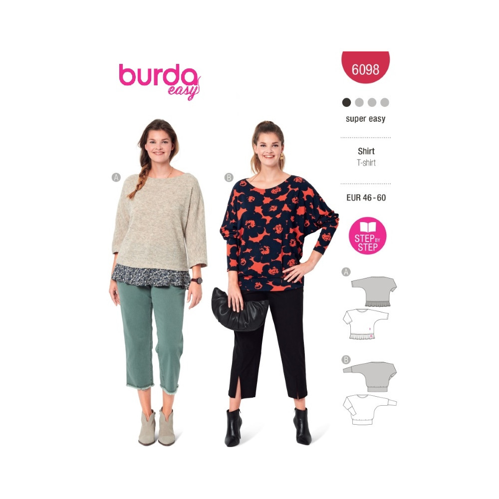 Střih ve velikostech EUR 46-60, úroveň obtížnosti šití: 1 velmi lehká info, doporučené látky: pouze bi-elastický žerzej