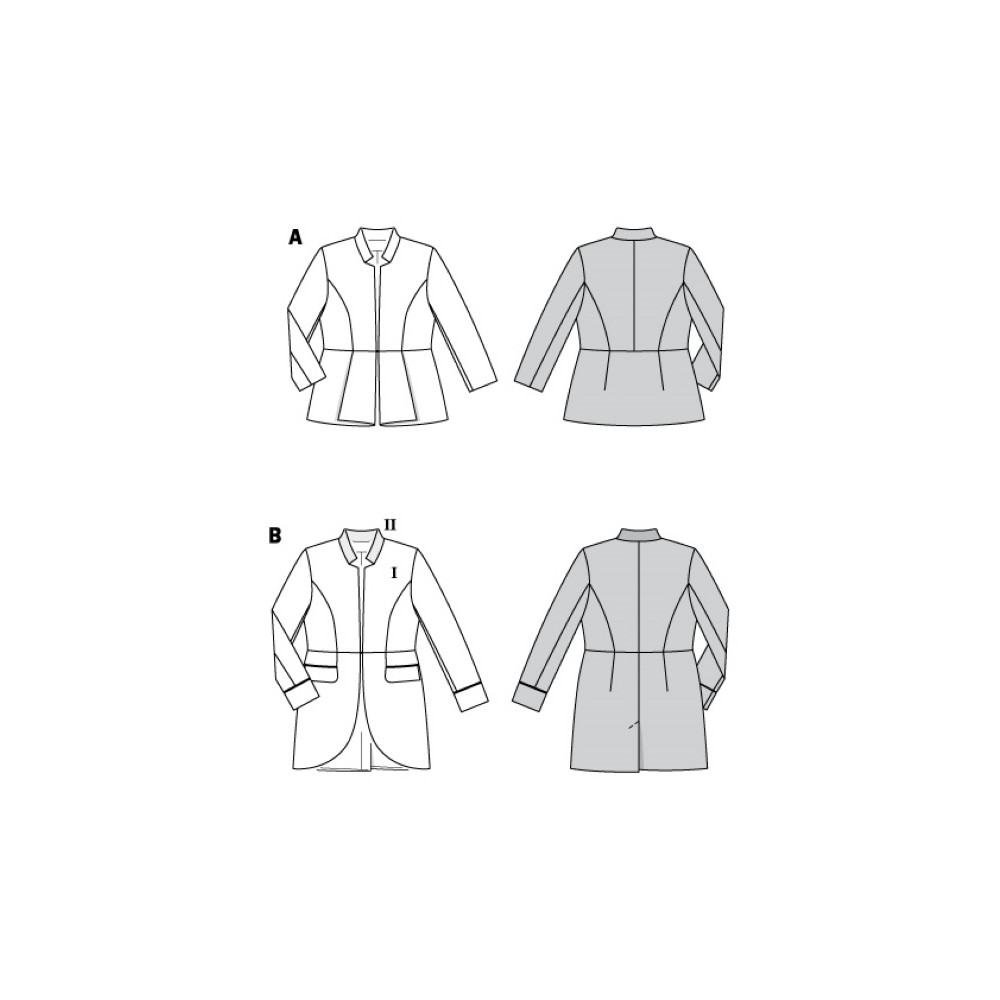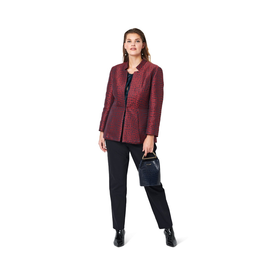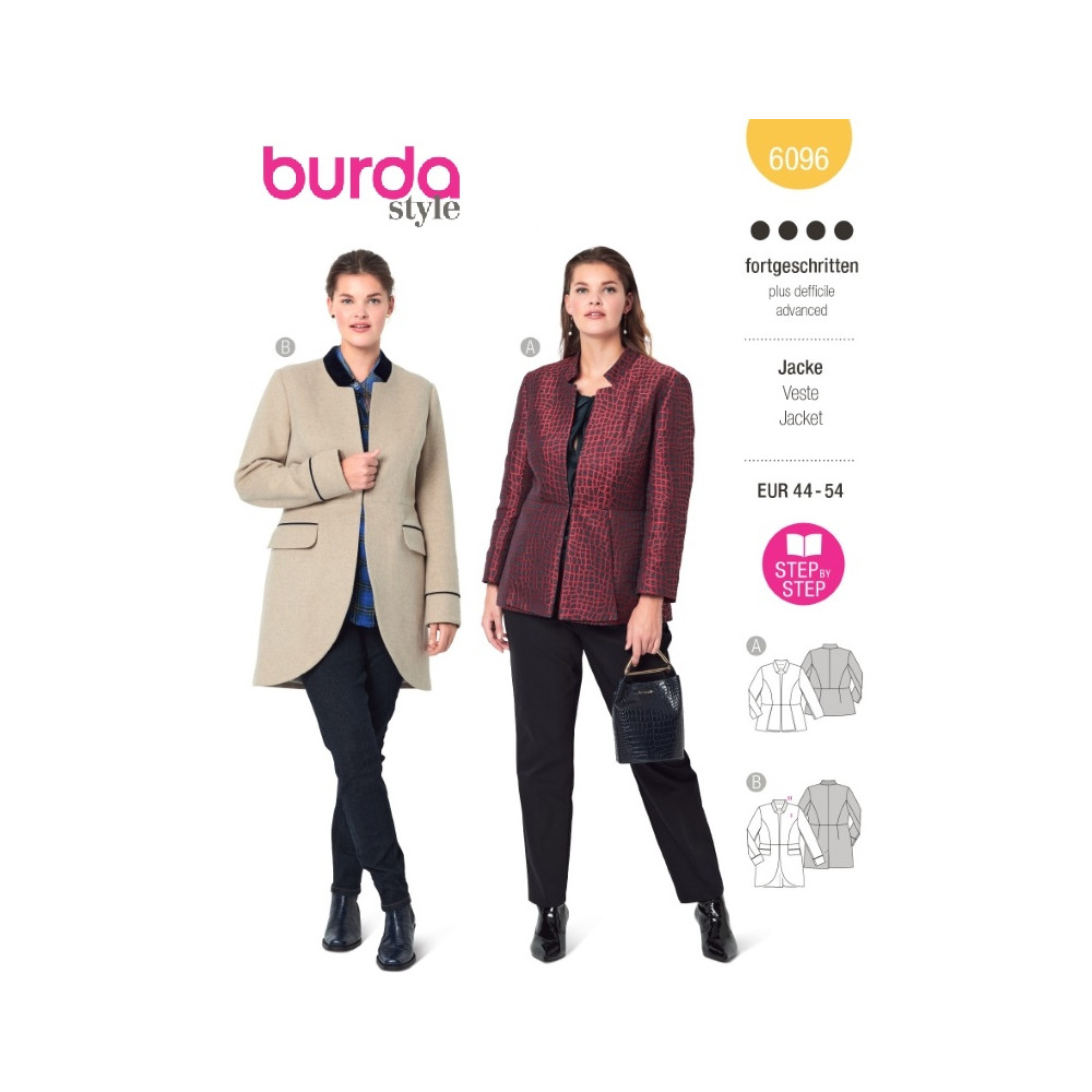Střih ve velikostech EUR 44-54, úroveň obtížnosti šití: 4 pokročilá info, doporučené látky: vlněné látky, gabardén, žakár