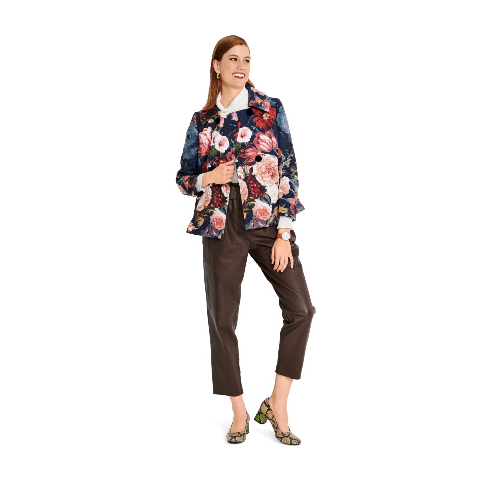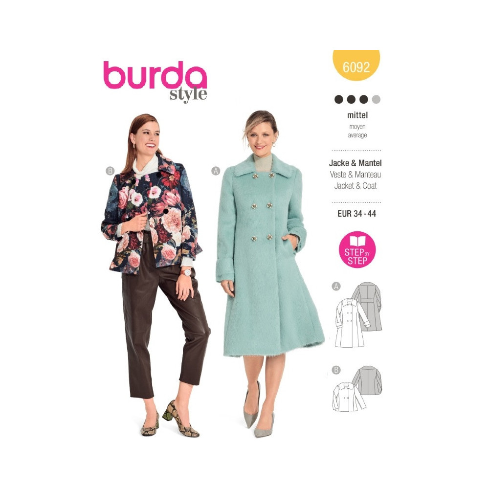 Střih ve velikostech EUR 34-44, úroveň obtížnosti šití: 3 střední info, doporučené látky: vlněné látky, tvíd, buklé